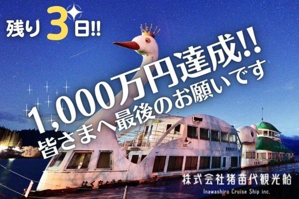 株式会社猪苗代観光船の渡部英一です。クラウドファンディングのご支援をいただいた皆様、誠にありがとうございます。はくちょう丸・かめ丸運航の近況とリターン発送についてご報告いたします。はくちょう丸・かめ丸の運航についてはくちょう丸・かめ丸の運航についてですが、許認可が予定よりも早く下り、10月29日(金)にはくちょう丸を先行就航することが出来ました。かめ丸は今後、改装工事に入る予定で再就航の時期が決まりましたら改めてお知らせ致します。はくちょう丸を先行就航でき、待ち望んだ皆さんが大勢ご乗船いただき感謝に堪えません。当分の間は金・土・日・祭日・貸切予約等の運航予定です。皆様のご乗船をお待ちいたしております。リターンの発送についてリターンの発送について大変お待たせしており申し訳ございません。現在おおよそのリターン発送は完了しましたがアンバサダーカードの納品に遅れが生じてしまい、一部未発送の方々がいらっしゃいます。万が一、11月中旬までにリターンがお手元に届かない方がいらっしゃいましたらご連絡をいただけますと幸いです。また、遊覧船利用券に一部誤表記がございました。表面に「特別クルーズではご利用いただけません。」と表記がありますが、当初ご案内していた通り湖上レストラン、チャーター運航、サンセットディナークルーズ、天体観測プランなど今後遊覧船にて提供を予定しているサービスに利用券を使うことが可能です。混乱を招いてしまい申し訳ございません。アンバサダーカードの特典内容について長らく謎に包まれていたアンバサダーカードの特典内容をホームページにて公開しました!アンバサダーカードをお持ちいただくと同伴の方も含め下記の割引が適用されます。お連れの方が多ければ多いほどお得になりますので、ぜひご友人やご家族などとご一緒にお越しください!【割引内容】- 遊覧船乗船 2割引- それ以外のサービス(宿泊、グランピング、レストランなど) 1割引※特典内容は予告なく変更となる場合があります。※有効期限はございません。今後の情報発信について今後のお知らせにつきましては、主に下記のホームページおよび各種SNSにて行ってまいりますのでいいね、フォローのほどよろしくお願いいたします。HP:https://i-kankousen.co.jp/Facebook:https://www.facebook.com/ikankousenTwitter:https://twitter.com/i_kankousenInstagram:https://www.instagram.com/ikankousen/今後も感謝の心を忘れず、遊覧船事業に邁進してまいります。クラウドファンディングを通じてご支援いただいた皆様、今後もサポーターとして遊覧船事業にご支援ご協力を賜りますようよろしくお願いいたします。ご支援いただきました皆様に、改めて感謝と御礼を申し上げます。