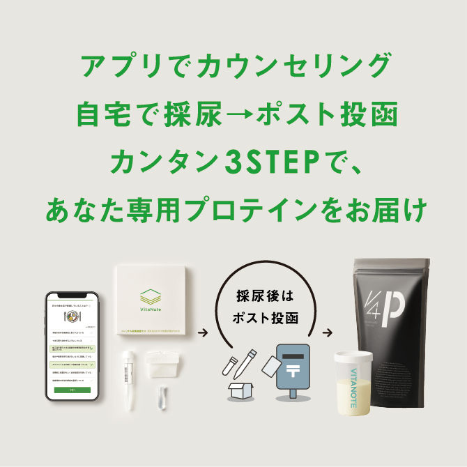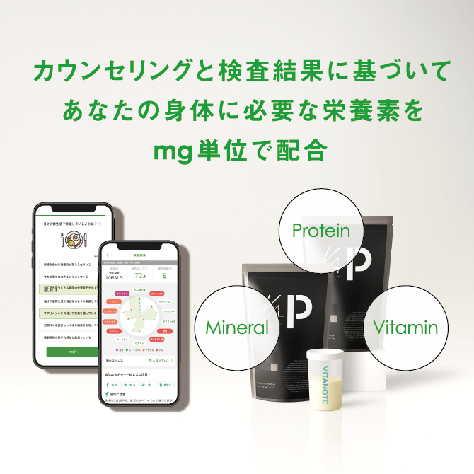 不足している栄養を適切に摂取することが大切です。足りなくなっても摂りすぎでもいけません。VitaNote FOR Proteinは、栄養状態が科学的にわかる検査の結果に基づいて、最適な栄養素の量(栄養バランス)に仕立てる商品なので安心しておすすめすることができます。