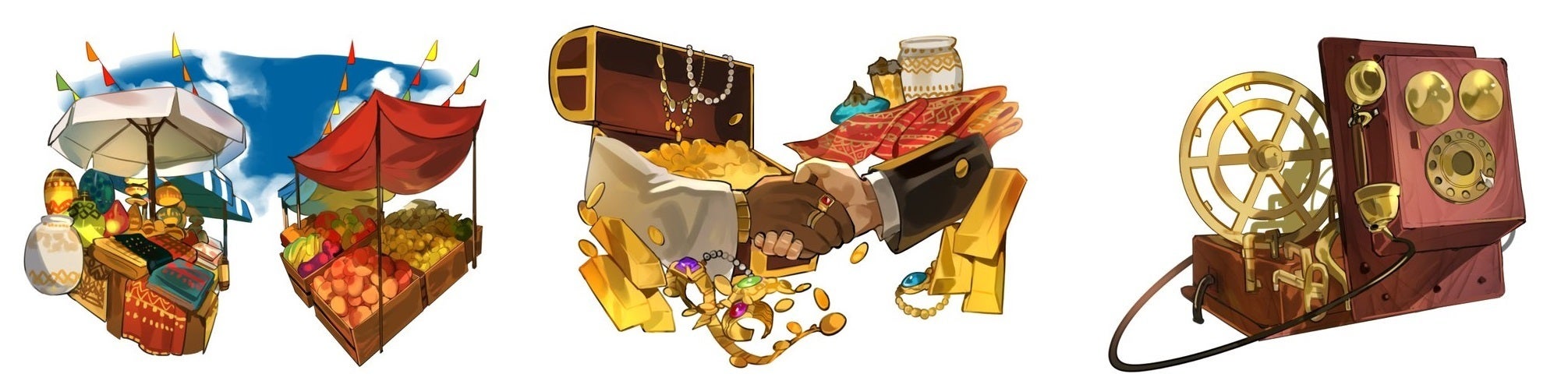 左から順にテクノロジーカードイラスト 市場・貿易都市・電信機