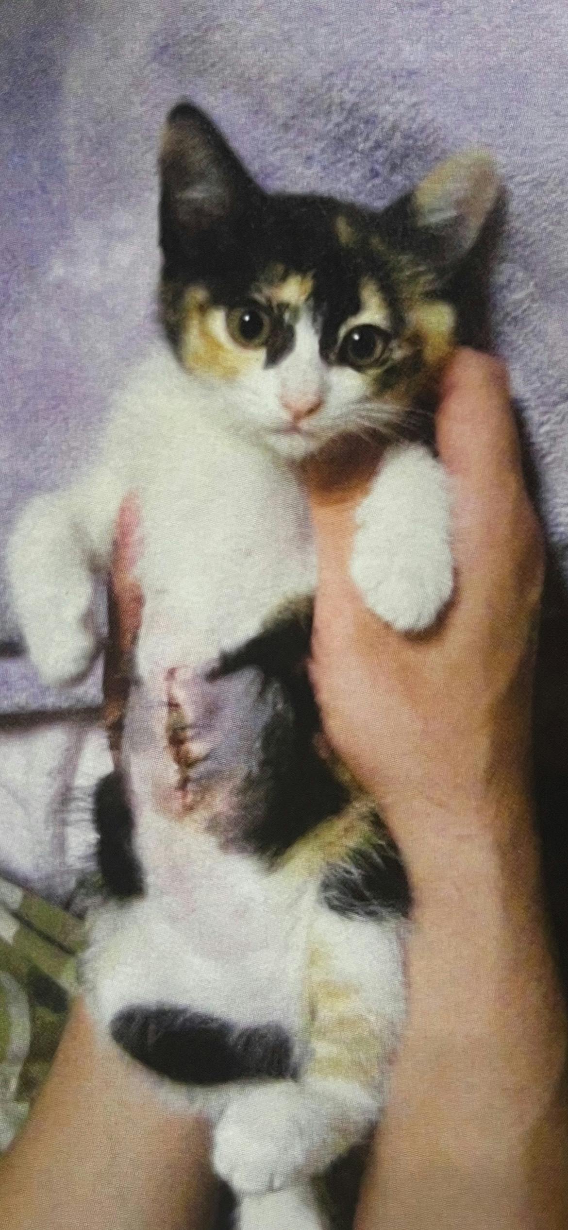 診断は、交通事故に遭っており横隔膜破裂、失明、下半身麻痺でした。 体重650グラムと小さな体でした。