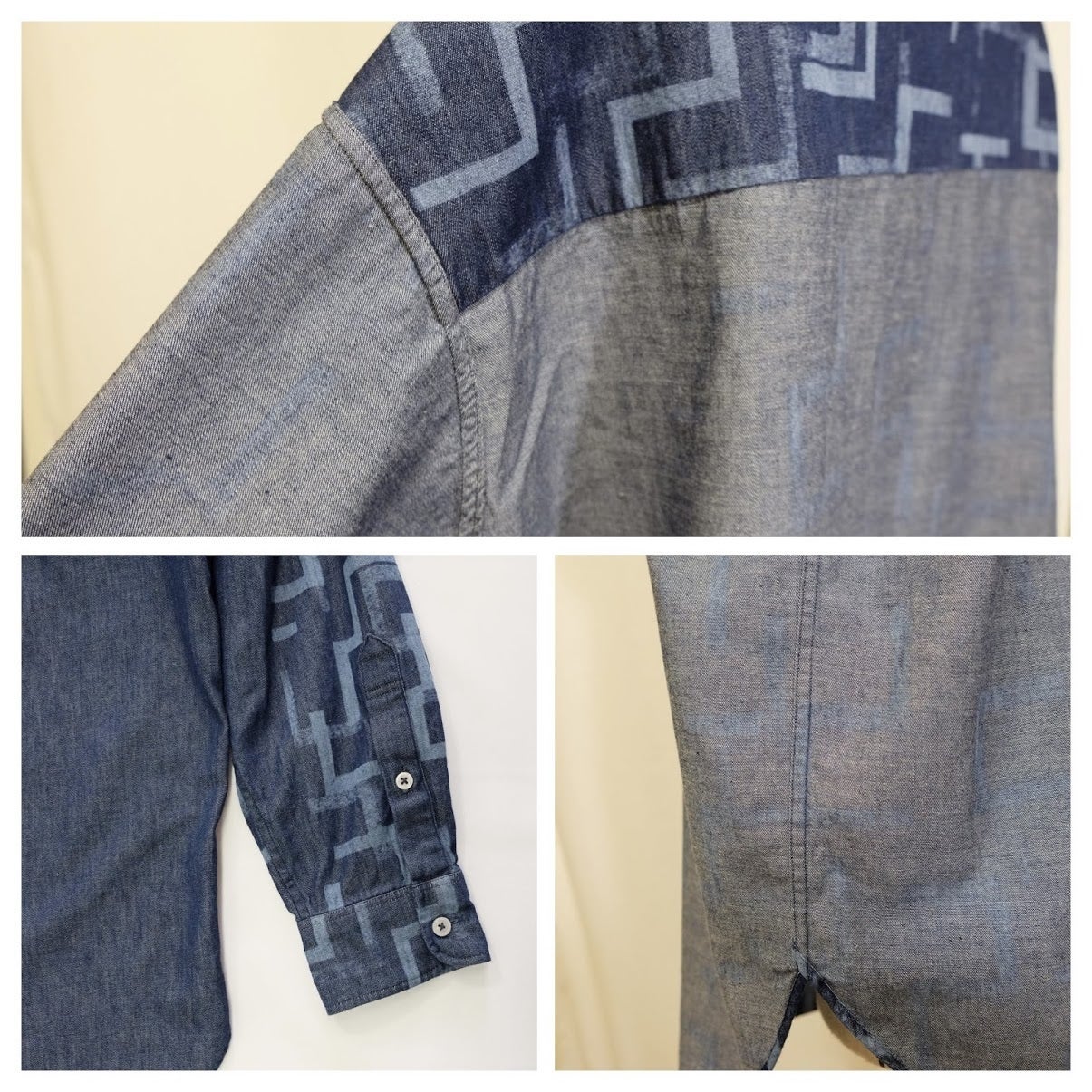 今回作ったデニムシャツは市場に流通しているプリント生地ではなく、カメレオンオリジナル柄を抜染加工した生地を使用しており、他には無い希少価値の高いものとなっています。