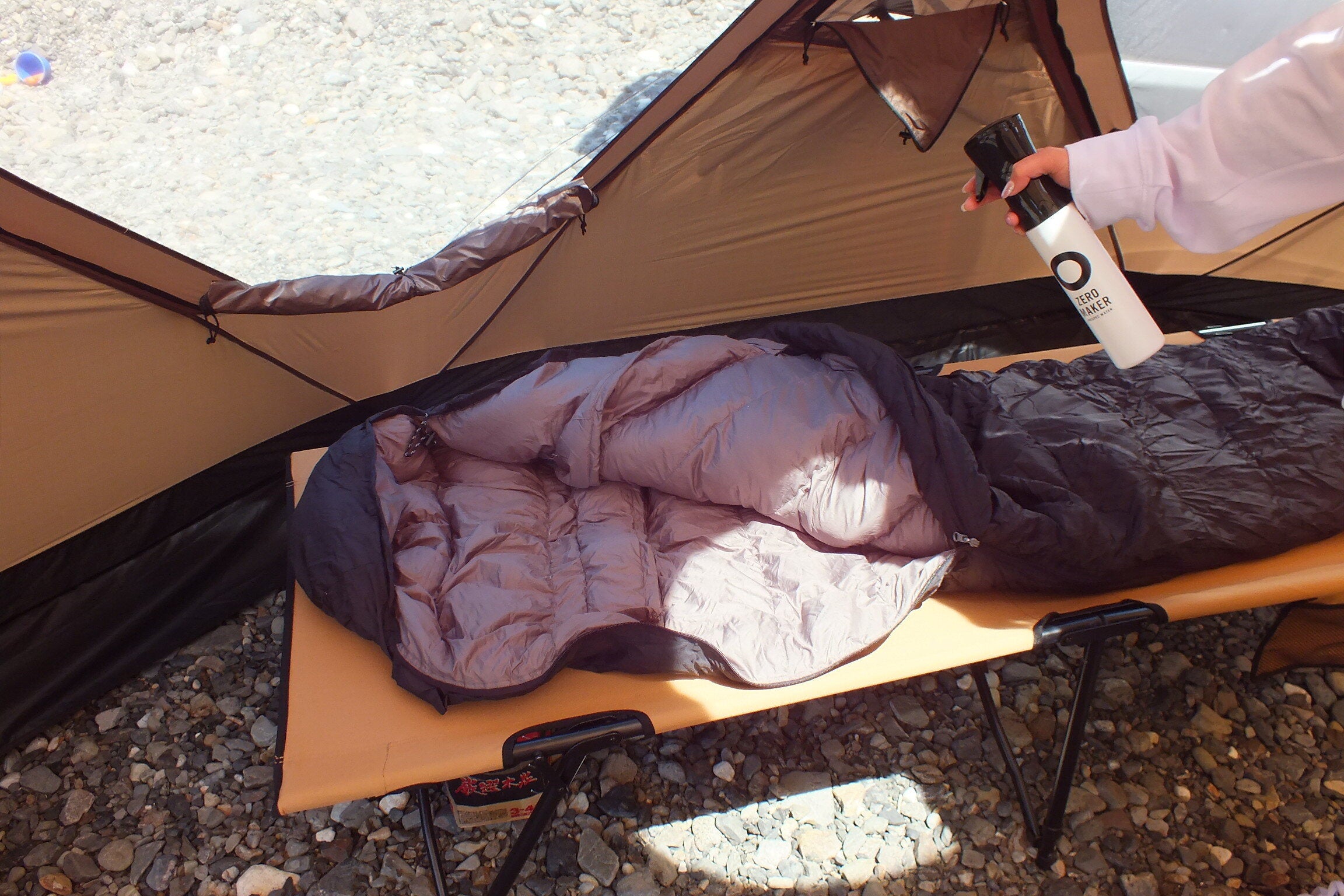 アルコール不使用のZERO MAKERなら、中の素材も生地も、お子様の寝袋だって気にせずスプレーできちゃいます!