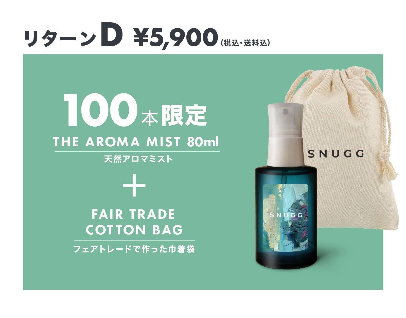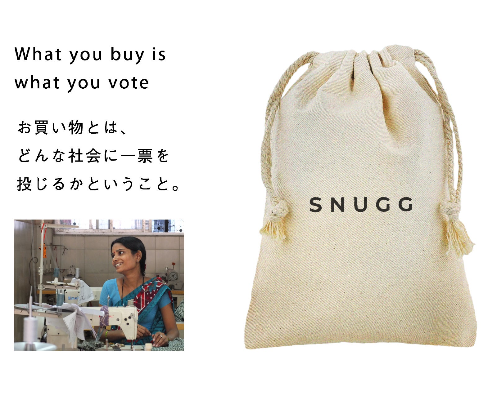 SNUGG The Aroma Mist に合わせて特別にお届けする巾着袋はフェアトレード※ + 環境に優しいオーガニックコットンで作ったロゴ付きのオリジナル商品になります。こちらは1999年からビジネスで社会課題解決を実践している、京都のシサム工房様にご協力いただきました。シサム工房は6カ国13団体のNGOと連携し、活動の透明性が保証される世界フェアトレード連盟(WFTO)への加盟が決定しています。