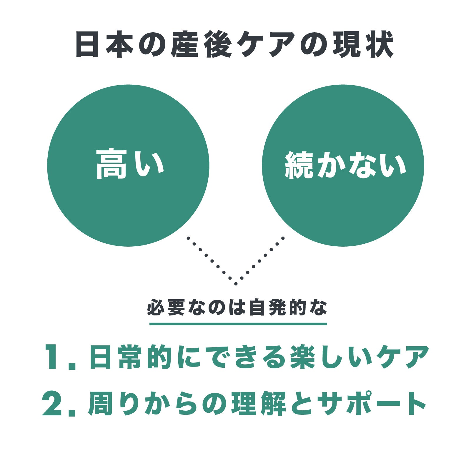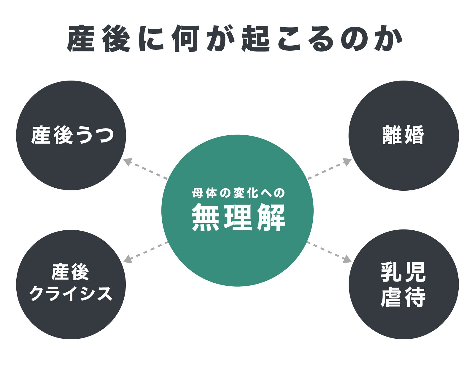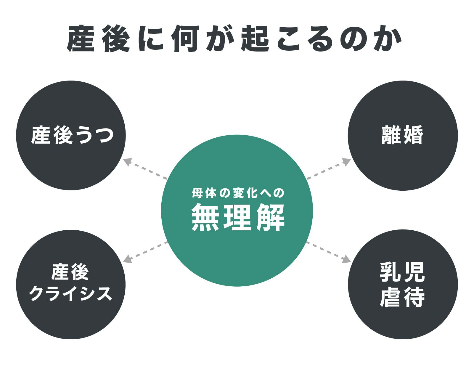 そして症状が悪化すれば自殺や乳児虐待にもつながります。産後夫婦仲が悪化する産後クライシスも大きな問題です。その結果、夫婦間の不満が長引き、離婚につながることも少なくありません。これもやはり原因の一つとして、母親の心身の変化に対する無理解があると思います。