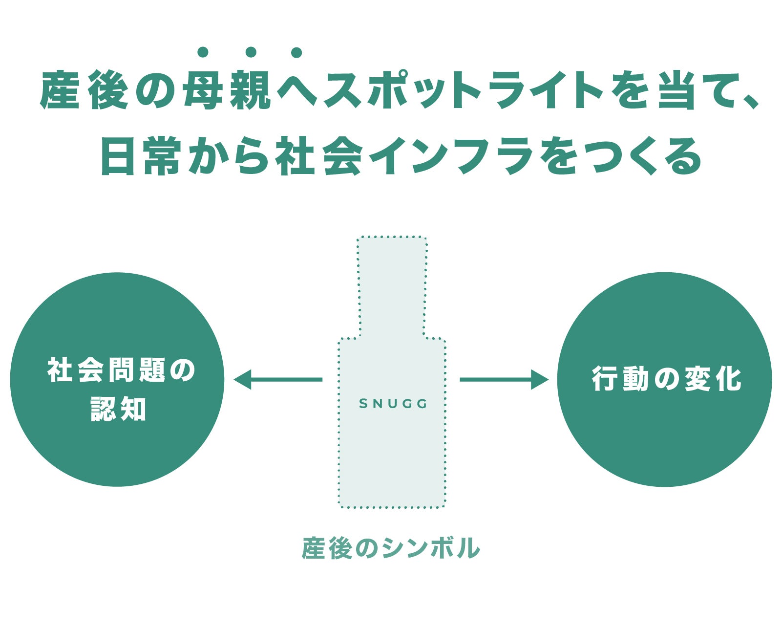 SNUGG The Aroma Mist は身体へのアプローチ以外に、日常的に楽しく触れて使えるものです。これが一つの補助線となることによって多くの人が産後の社会問題を意識し、周囲とのコミュニケーションや行動の変化を生むキッカケづくりを目指しています。