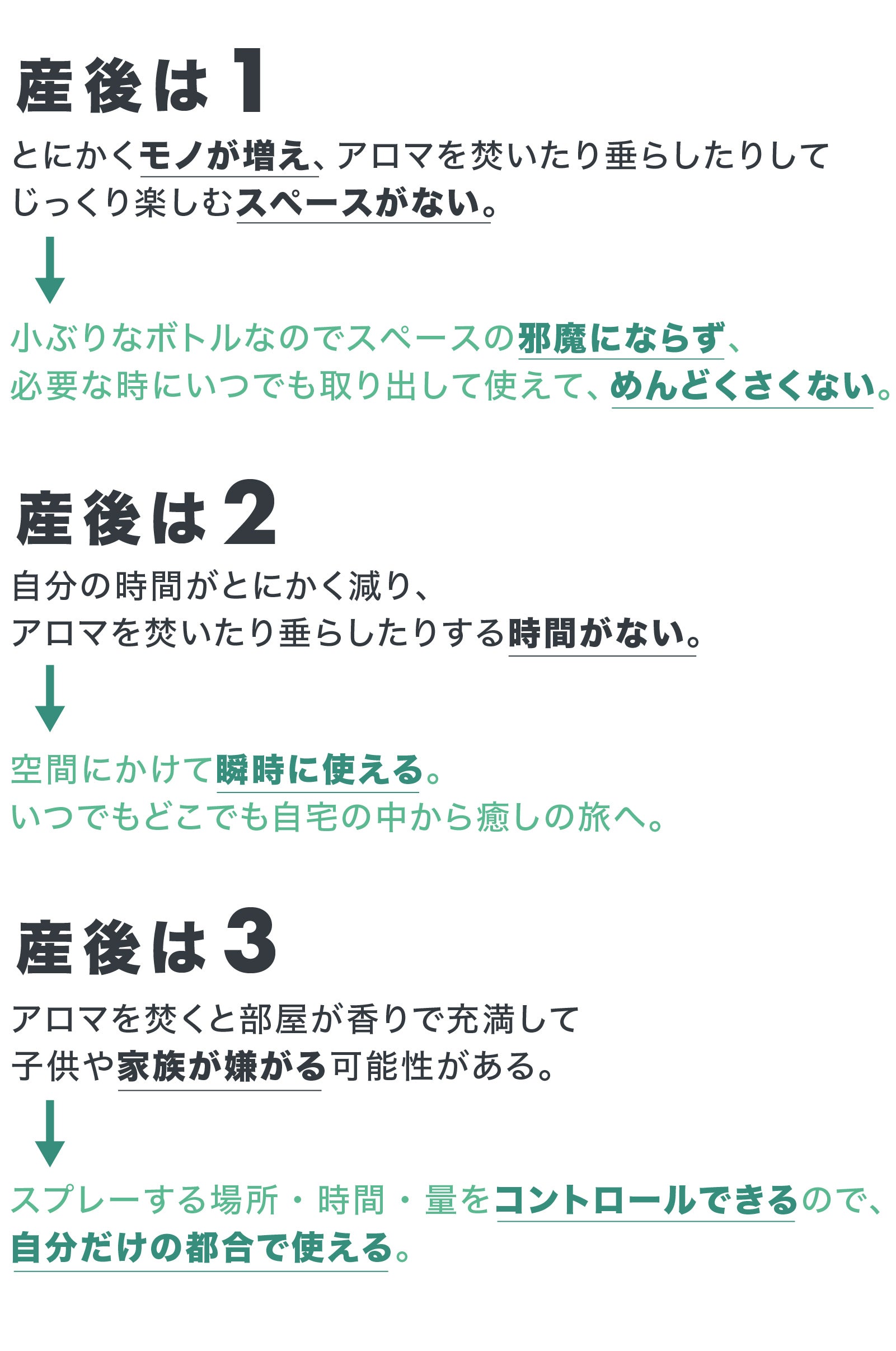 アロマを楽しむ方法は沢山あります。焚いて部屋を香りで充満させたり、お風呂に精油を垂らして香りを直に楽しんだりと様々です。しかし日常的な産後ケアのためになぜあえて80mlのミスト型スプレーをつくったのか。それはSNUGG The Aroma Mist が産後の生活スタイルの変化にマッチする3つの理由があるからです。
