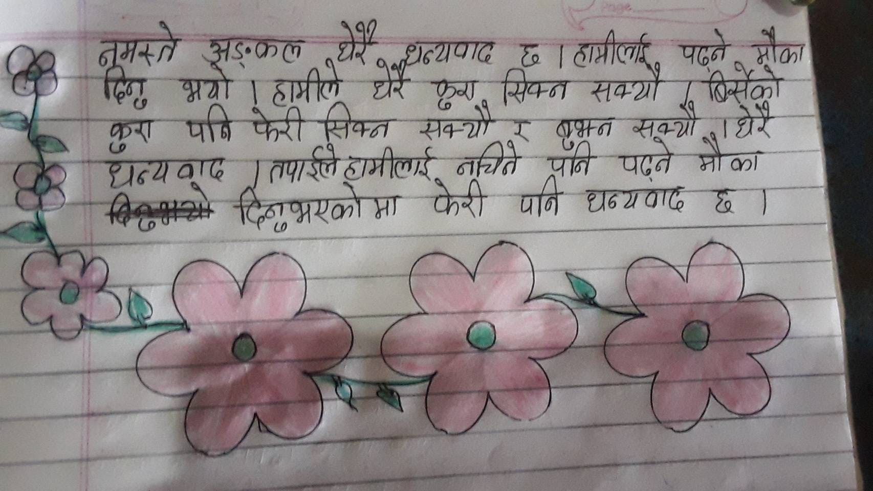 2021/09/18 00:32皆様ご支援をありがとうございます。生徒の一人であるネパールの女の子がぜひ皆さんに感謝を伝えてほしいということでお手紙をくれました。以下に訳します。こんにちは 皆さん ありがとうございます。私たちに勉強する機会を設けてくれました。私たちはたくさんのことを勉強することができました。ありがとうございます。忘れていたこともまた学ぶことができ、理解することができました。皆さんは私たちと会ったことがないのに助けてくださり、ありがとうございます。この子は特に計算で掛け算と割り算を逆にしてしまっていましたが、今ではばっちりです。皆様、今後ともよろしくお願いいたします。 もっと見る