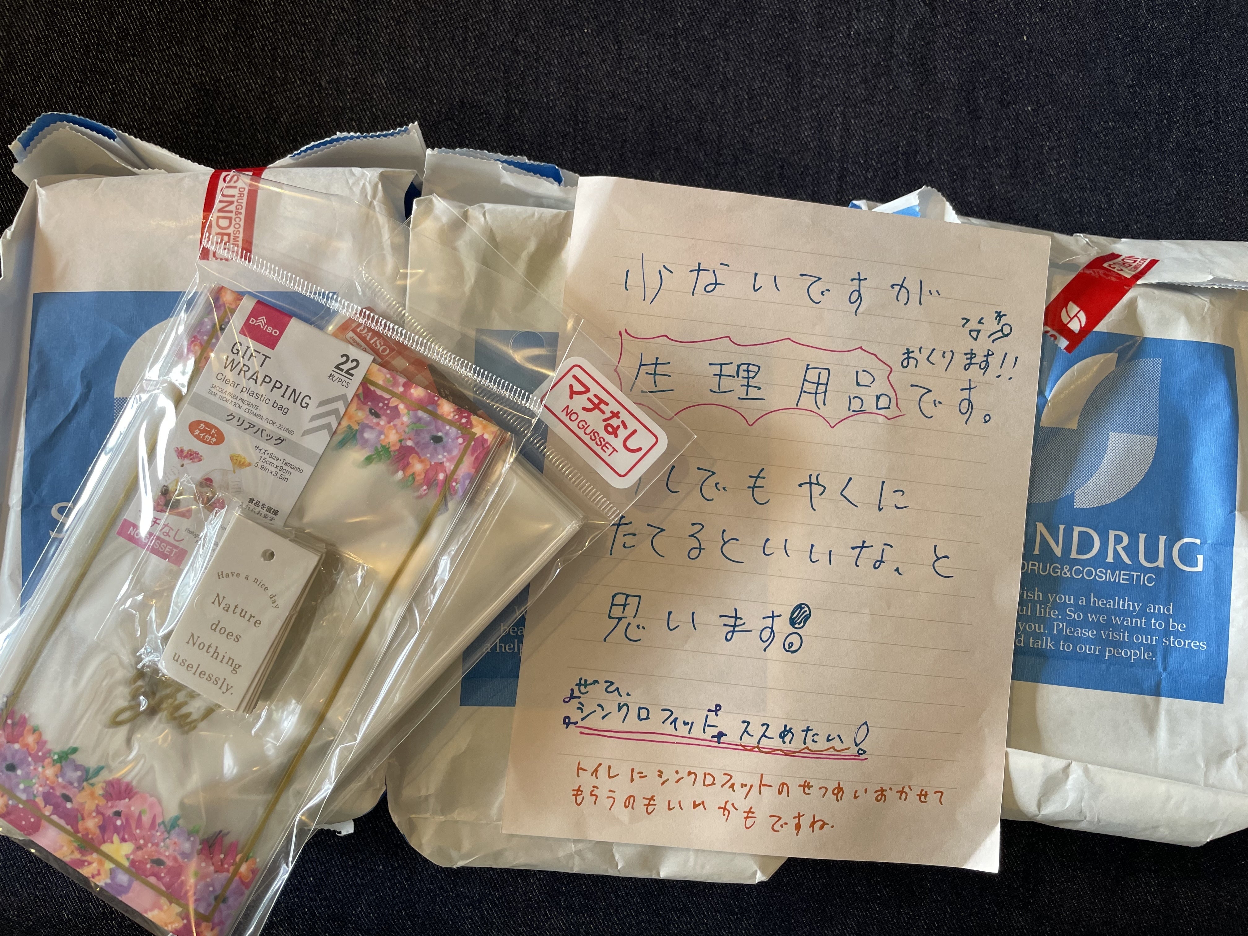 生理用品の中にはお手紙も!生理用品のオススメの物を送ってくださいました。