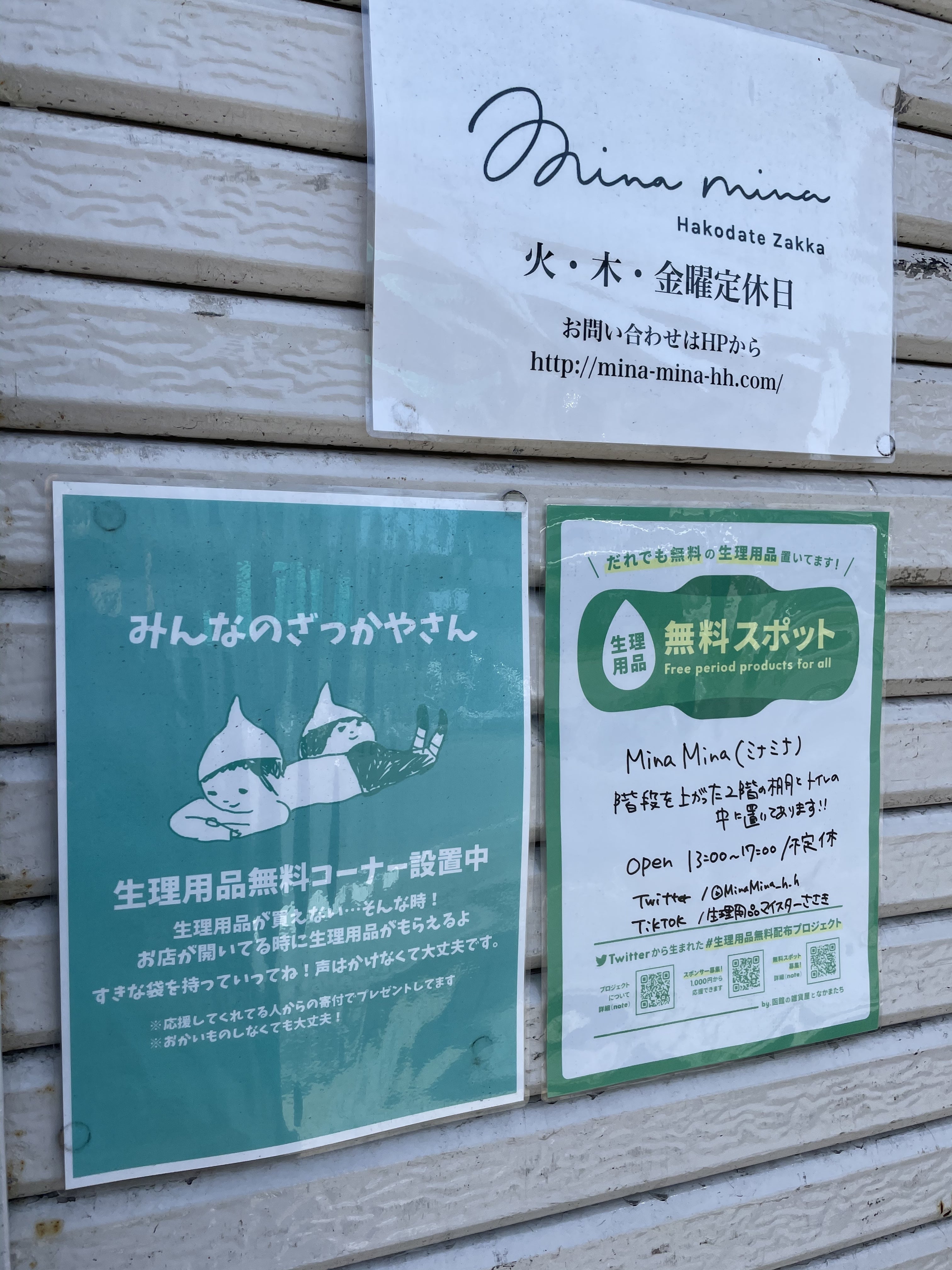 【生理用品無料配布プロジェクト】の拠点は雑貨屋です。雑貨屋のシャッターには、このように生理用品無料配布スポットの掲示をしています。