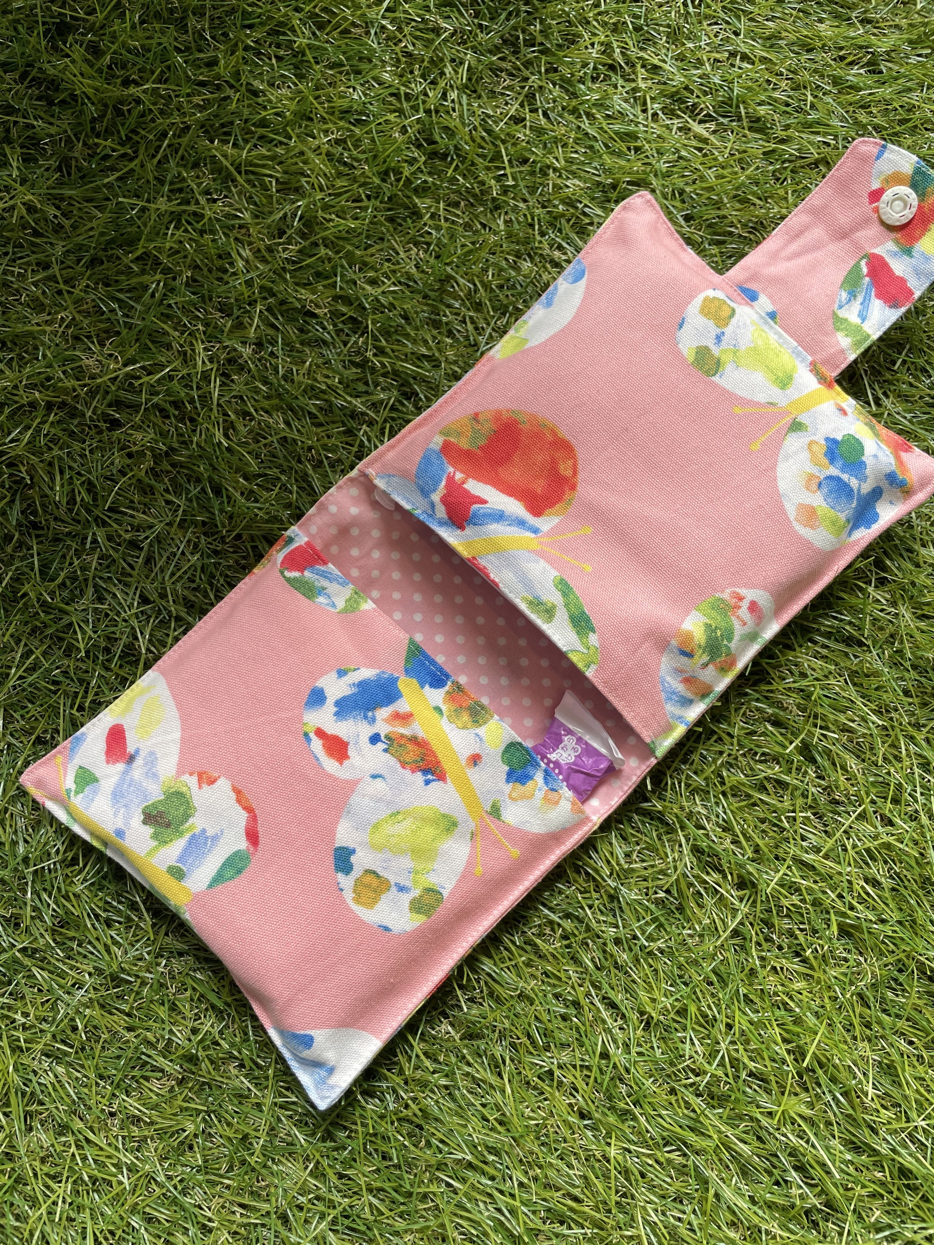 ポケットの片方は夜用40cmサイズがぴったり!もう片方は昼用が3つ入り、さらにタンポンを入れる場合も落ちない様に中央のあき部分は狭めに、スナップボタンは生理用品入れて膨らんでも対応できる絶妙な位置に設定されています。