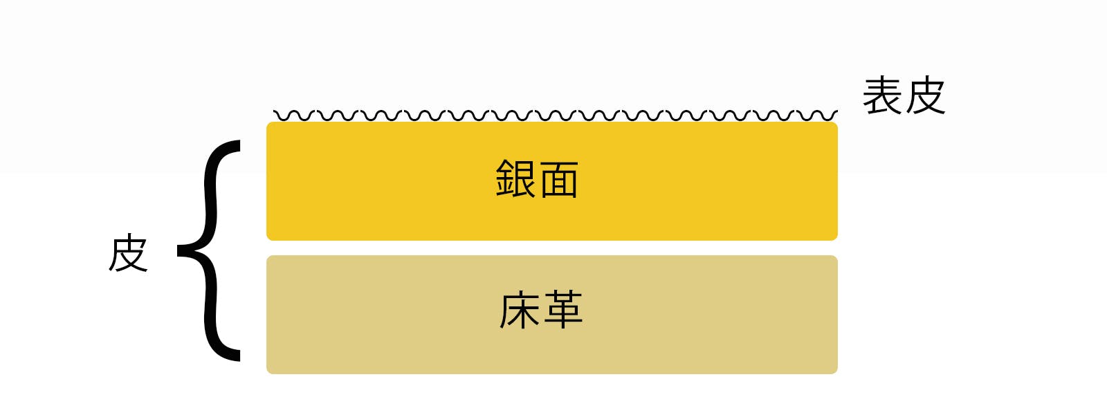 牛革は表面の皮部分(銀面)と内側の皮部分(床革)から構成します。表面の皮部分(銀面)を使用した革を「トップレザー」と言い、表皮が付かない裏側の皮部分(床革)を使用した革を「スプリットレザー」と言います。