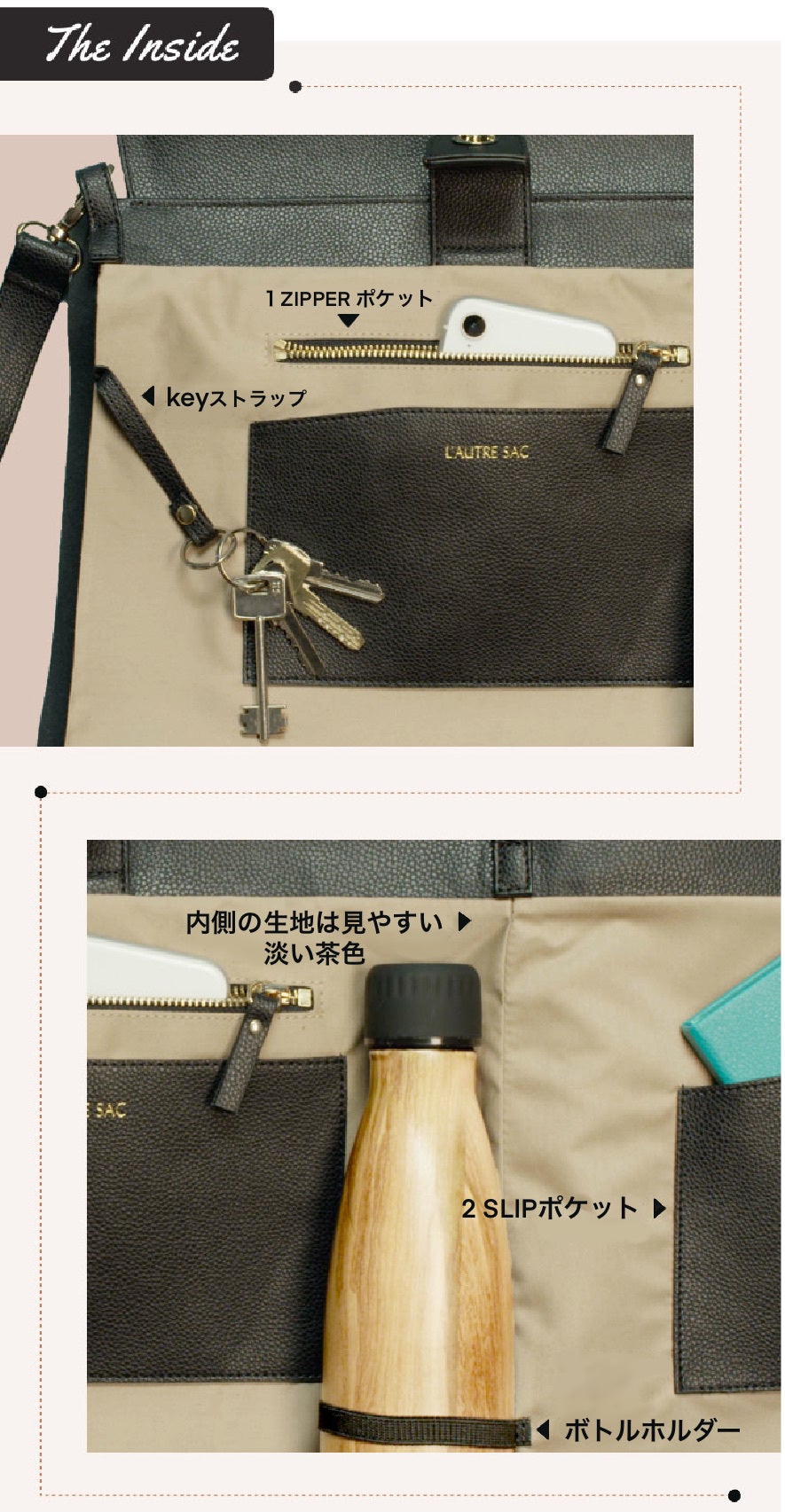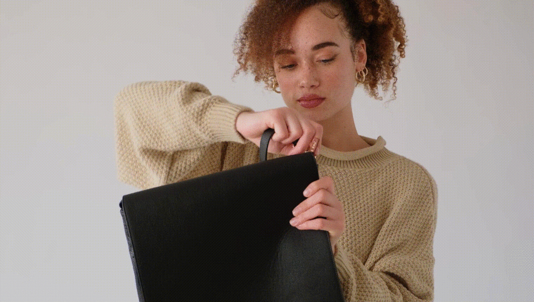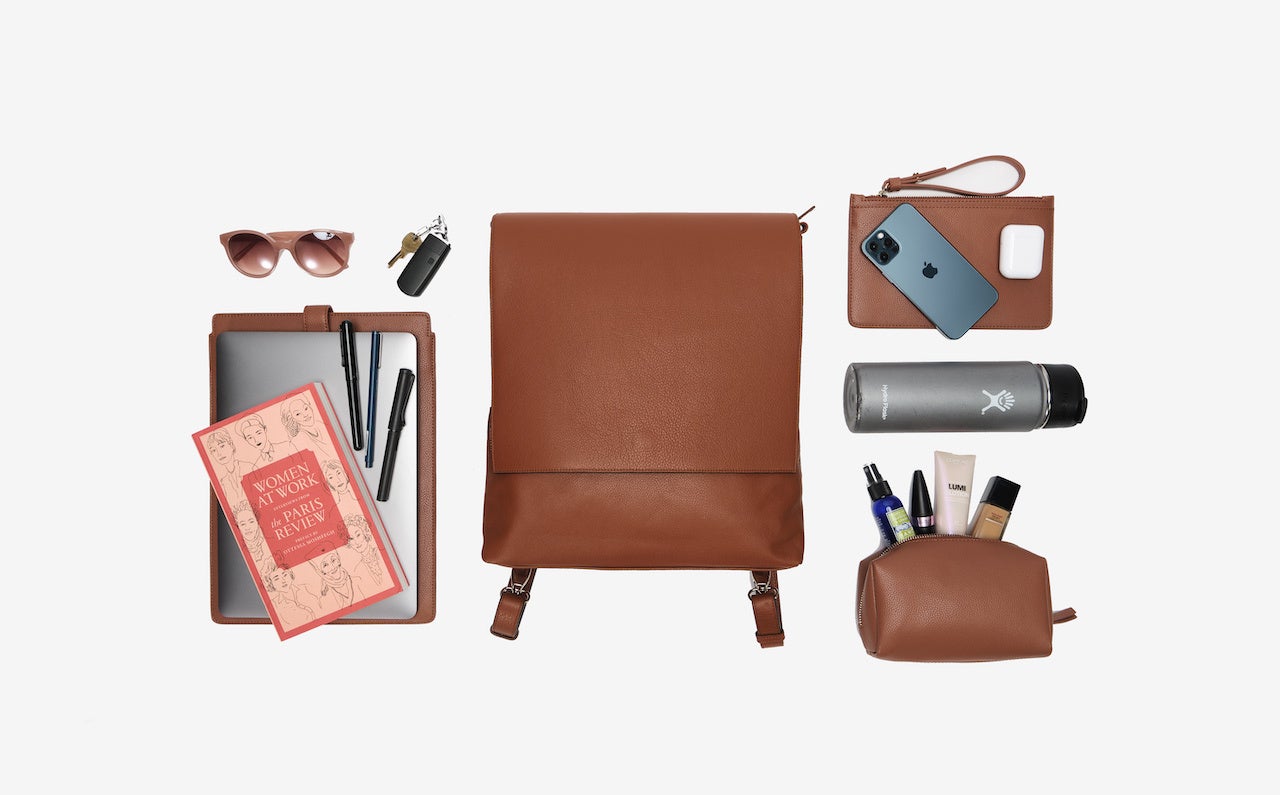ラップトップ、携帯電話、書類、ノート、化粧品、ウォーターボトルなどすっきりと収納できます。