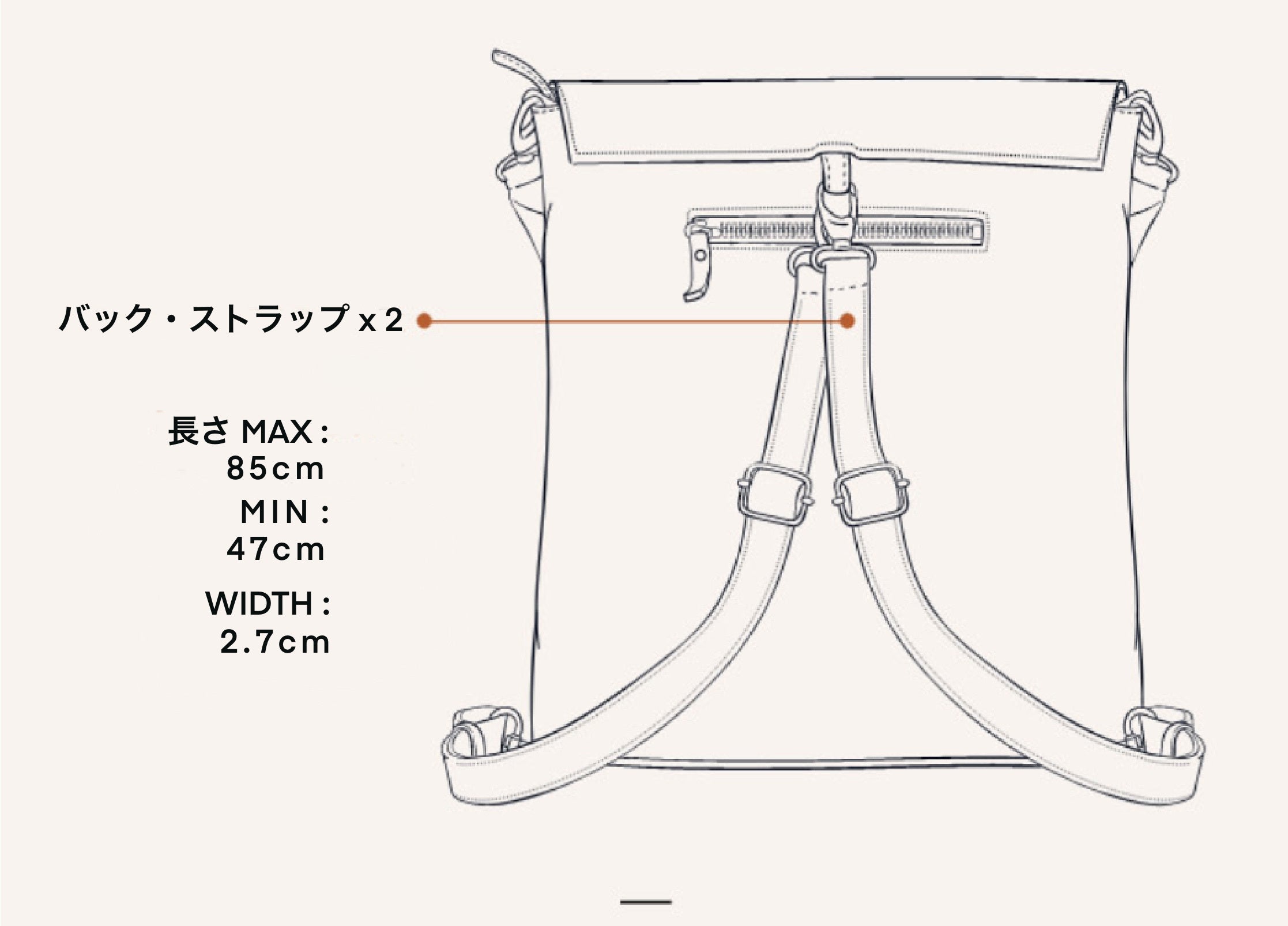 バッグの背面上部中央にあるループに2本のフラットストラップ(長さ調整可能)を取り付け、各ストラップを下部にある左右のループに取り付けたらバックパック仕様になります。
