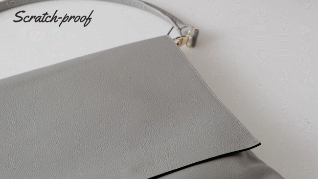 ペットが引っ掻いたり、鍵などで引っ掻いても擦ってもキズがつきません。混雑している電車の中や人混みの中、どこかにひっかけたりしても、通常レザーの様なキズ跡は残らないので安心して使えます。