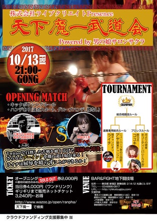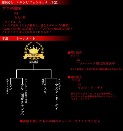 第0試合 プロ格闘家vsらいち(予定) エキシビジョンマッチ キックルール ハンデあり(ライチ膝あり、グローブの種類) Twitterで白熱した舌戦!ブーイングの中奴は来るのか?そしてライチはいきなりボコになるか? 第一試合 ライチvsニューハーフ姿三四郎あや ライチ打撃か、柔道で国体出場経験のあるあやか。 第二試合 コユキvsマスクドゲイ 前エキシビジョンで、ライチを締め殺しかけたコユキvs刑務所あがりのマスクマン、マスクドゲイ 決勝を制したものが国内ニューハーフチャンプとなる