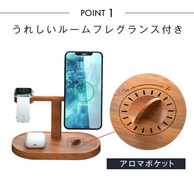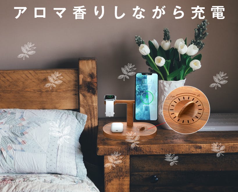 ワイヤレス充電器が市場にたくさん出回っているのですが、「リラックスできるワイヤレス充電器」が初耳でしょう。私たちの心や体を癒し、良質な睡眠をサポートしてくれるのが「香り」です。寝る前にアロマ機能を起動し、スマホやイヤホン、Apple Watchを充電器に置くだけで、ストレスによって緊張した心身を就寝前にリラックスさせましょう~翌日の朝がすっきりで、睡眠の質を上げることもできますし、デバイスたちも充電満タン! 在宅ワークの方にもおすすめです!アロマの香りで気分転換すれば、仕事の効率UPにも繋がりますよ!スマホを充電しながら、最適な角度でオンラインミーティングしましょう!