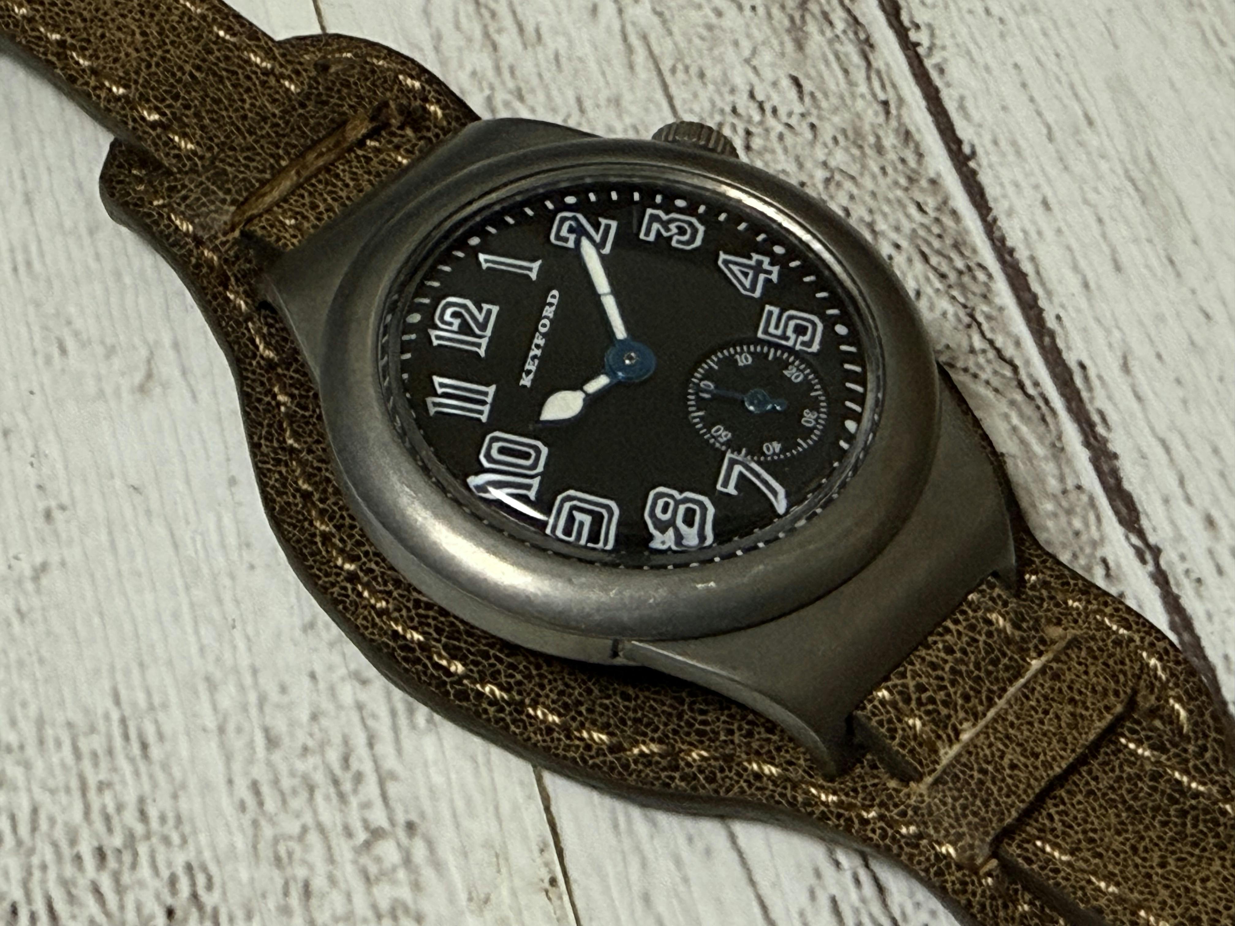 その懐中時計にワイヤーラグを取り付け、革ベルトを装着して腕に巻いたものがいわゆる「トレンチウォッチ」です。