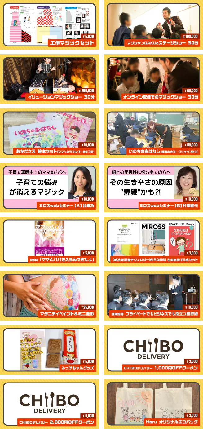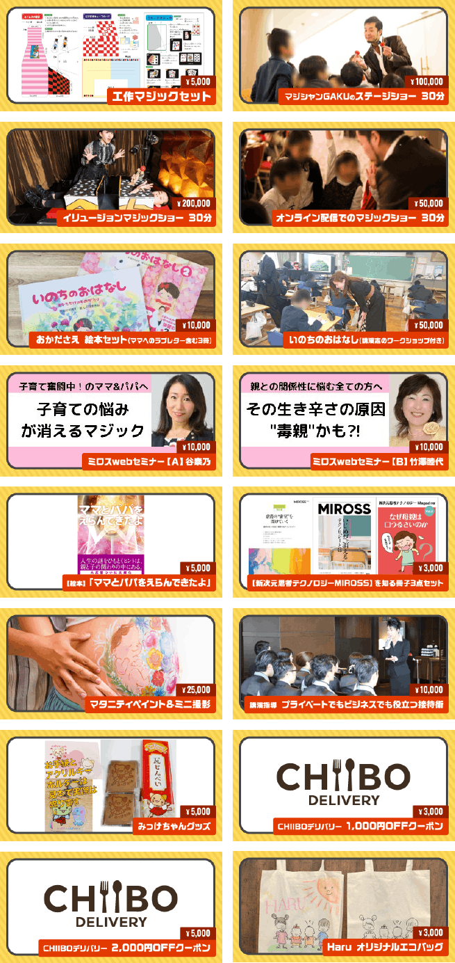 ママ・パパ・子ども・家族・市民・地域などをキーワードに、学びの講演・パネルディスカッション・絵本朗読や、笑顔の歌・弾き語り・イリュージョン等、9団体が各々によるパフォーマンスで感動をお届けします。リターンもバラエティーに揃えています。
