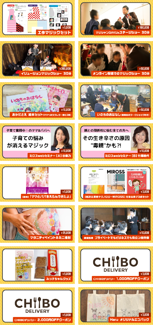ママ・パパ・子ども・家族・市民・地域などをキーワードに、学びの講演・パネルディスカッション・絵本朗読や、笑顔の歌・弾き語り・イリュージョン等、9団体が各々によるパフォーマンスで感動をお届けします。リターンもバラエティーに揃えています。