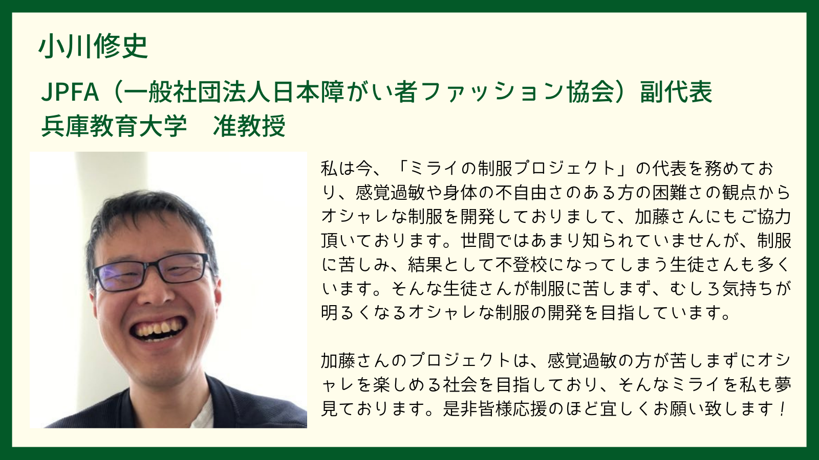 ただ服を作って売るだけのブランドにしたいとは思っていません。ただ、感覚過敏の人だけのための福祉ファッションにするつもりもありません。作り手、販売者、購入者が一緒に楽しめるアパレルブランドを立ち上げます。そのスタートに是非、ご参加いただければ嬉しいです。