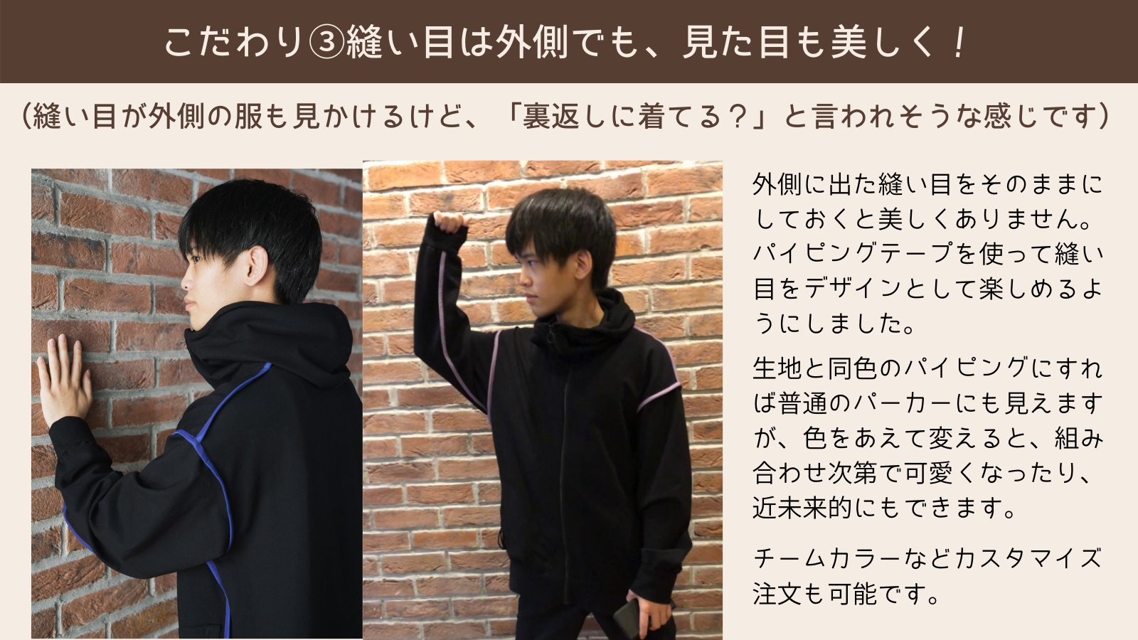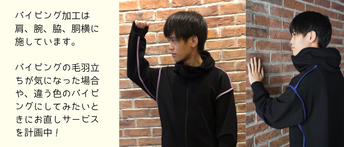 今回、クラウドファンディングで提供するパーカーは、縫い目を外側にし、パイピング処理をしています。パイピング加工は肩、腕、脇、胴横に施しています。このパイピングが日常的な着用によって、毛羽立ったり摩耗した場合に、または、別の色で楽しみたい場合に新しいパイピング加工をするお直し制度を作ろうと計画しています。(有料サービスです)