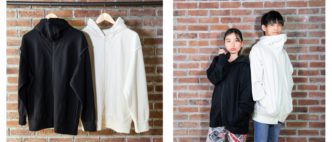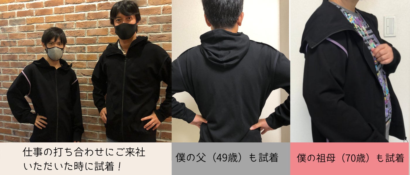 A:今回のパーカーに関しては大人サイズのみとなっております。ジップアップパーカーのため小さなお子さまの安全面を考えて、子どもサイズは用意しておりませんが、今後、販売予定の肌着やTシャツ、トレーナーなどは子どもサイズも用意する計画です。また、着脱が簡単にできるパーカーも開発したいと思っています。