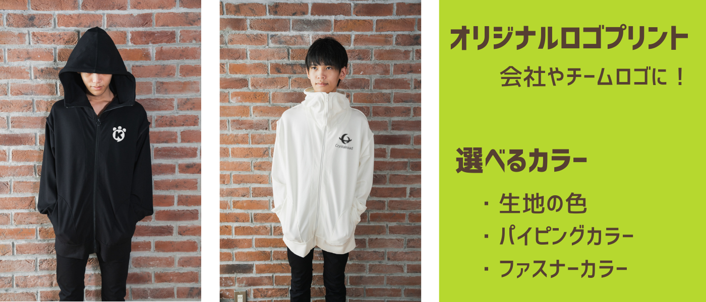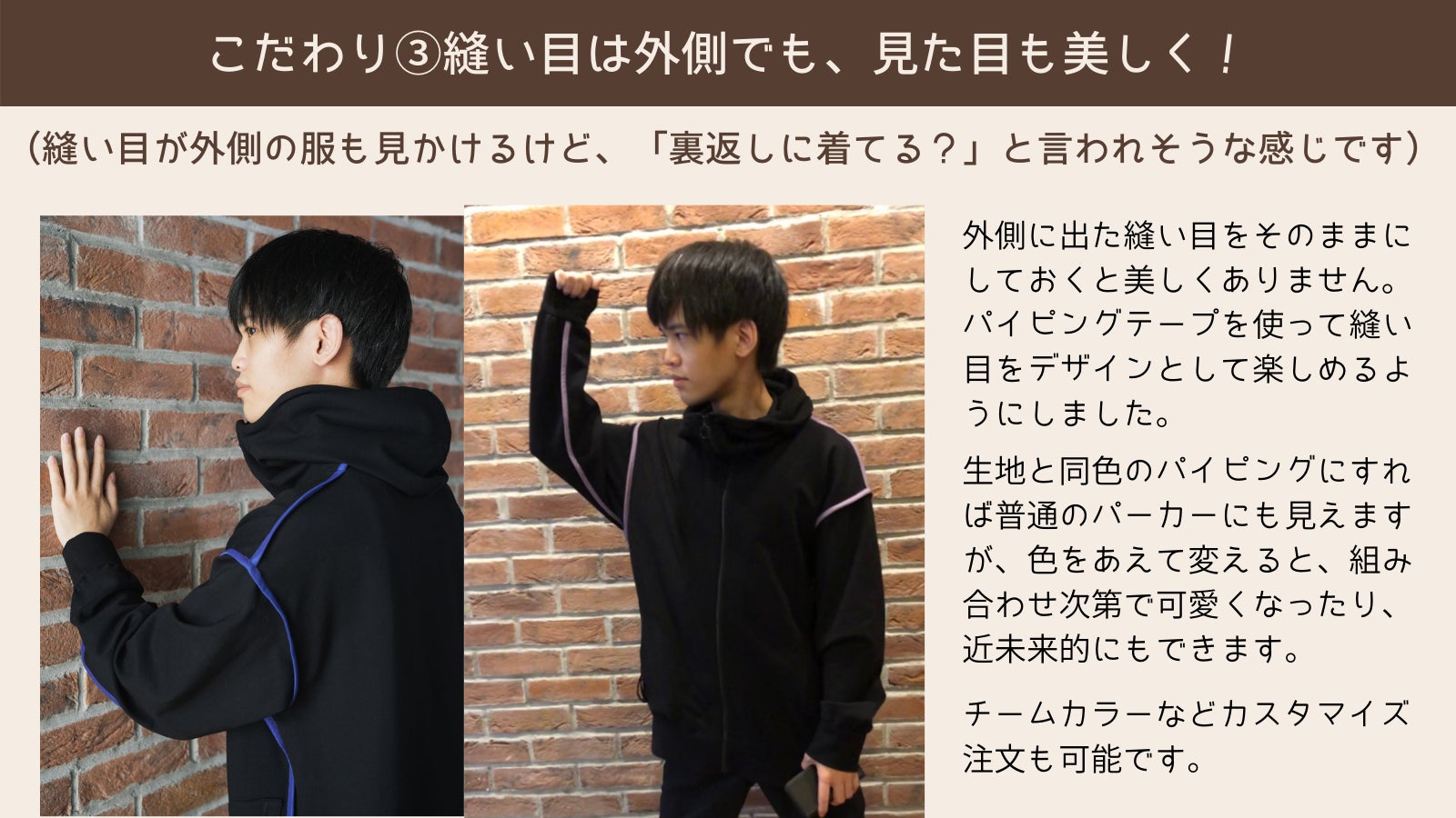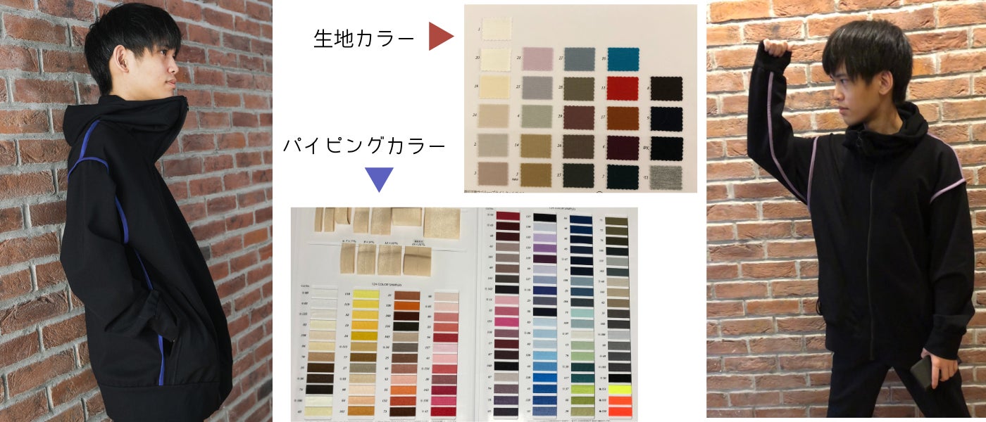 また、生地の色とパイピングの色を自由に選べるカスタマイズパーカーをクラウドファンディングのリターンで用意しています。ファスナーは基本は生地と同色を使用しますが、ファスナーの色もご希望があればカスタマイズ可能です。カスタマイズパーカーは、クラウドファンディング限定になるかもしれませんので、この機会に、好きな色、応援してるチームカラー、推しの色などアレンジをお楽しみください。カスタマイズパーカーの色やサイズのご指定はプロジェクト終了後にご案内いたします。