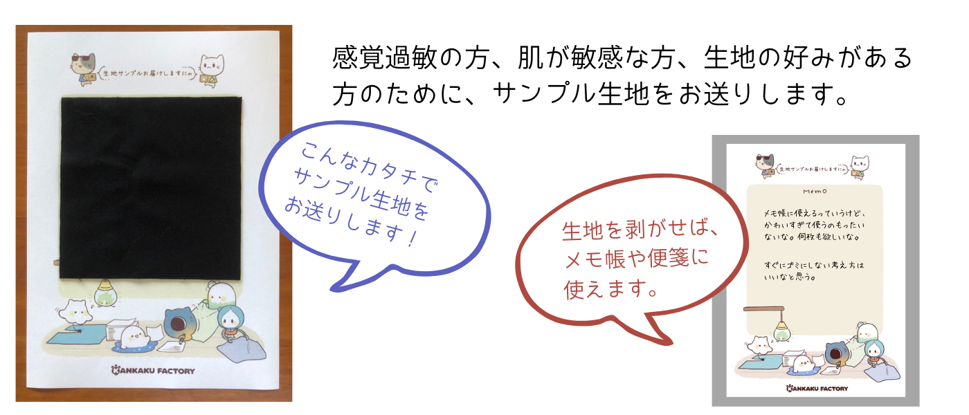 KANKAKU FACTORYの商品は国内で縫製しており、また縫製方法が一般の衣服とは違うため、縫製代が高くなります。その分、販売価格も高くなりますので、商品は長くご利用いただけたらと思っています。また、購入前のサンプル生地の発送も行いますが、それでも肌に合わなかったという場合もあるかもしれませんし、もう飽きて着なくなる場合もあるでしょう。そのような場合に捨てるのではなく、次のオーナーにお届けできる制度も考えていきたいと考えています。