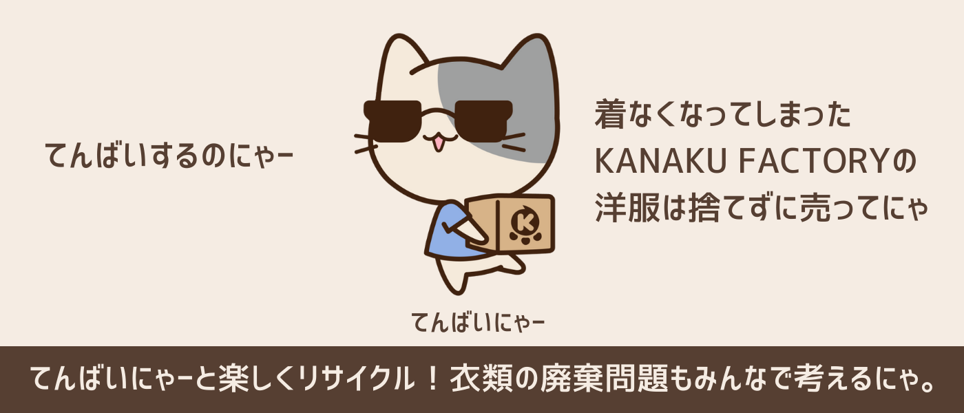 着なくなった服は、フリマサイトで販売してください。販売中のページのURLをご連絡いただければKANKAKU FACTORYのサイトで紹介できる「てんばいにゃー制度」を準備する予定です。KANKAKU FACTORYのキャラクラー「てんばいにゃー」から何か声がかかるかもしれません(笑)