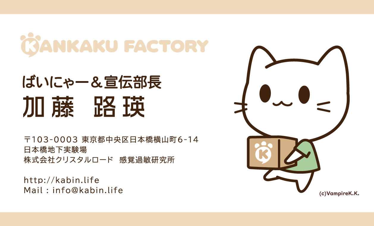 今回のプロジェクトにて、「ばいにゃー&宣伝部長コース」でご支援してくださった方に「ばいにゃー&宣伝部長」の肩書のついたお名前入り名刺を100枚お送りいたします。人気キャラになる予感のある「ばいにゃー」の肩書をぜひ名乗ってください!みなさんも、支援してくださった日から「KANKAKU FACTORY」の宣伝部長です。営業よろしくお願いします!
