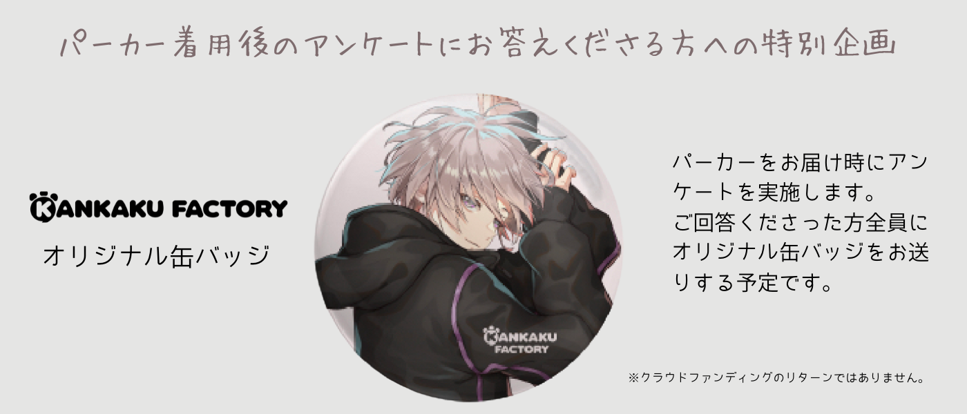 パーカーの着心地や改良点へのご意見をお聞きするアンケートを実施します。回答にご協力くださった方に、オリジナル缶バッジをお送りする予定です。このクラウドファンディングのために描き下ろしていただいたイラストです。販売予定もないレアな缶バッジですので、是非、パーカーを着用いただき、アンケートに答えていただければと思います。みなさまからご意見をいただきながら、みなさまとともに進んでいけるブランドにしたいです。