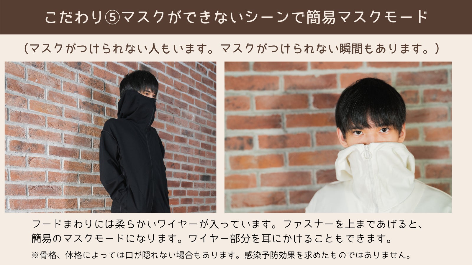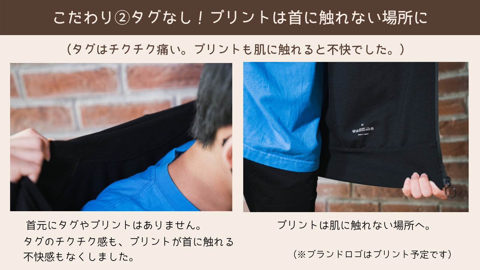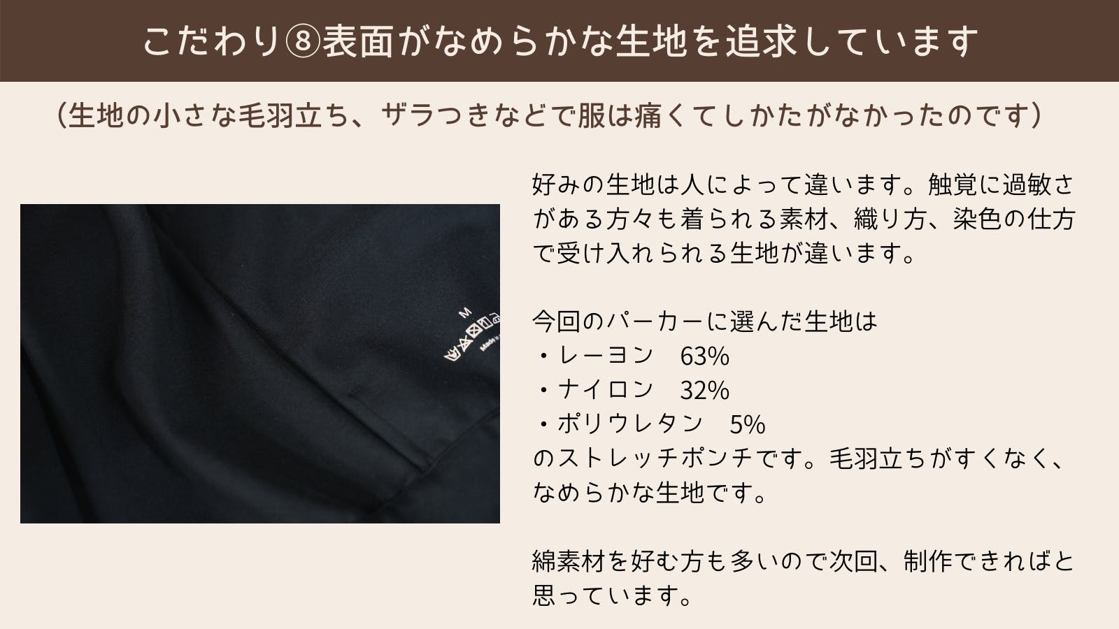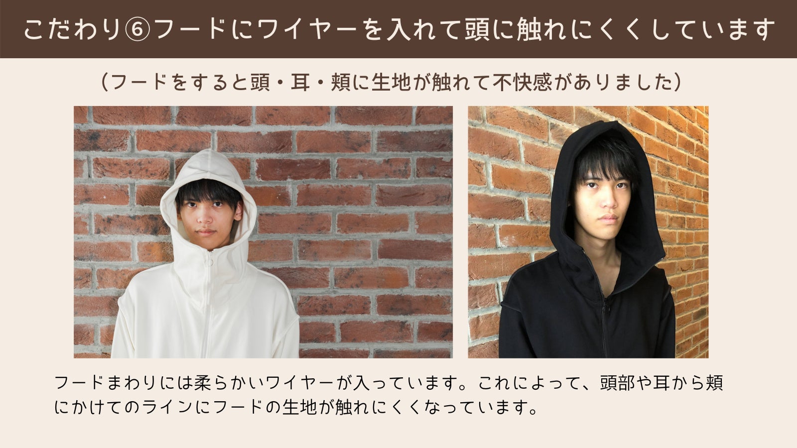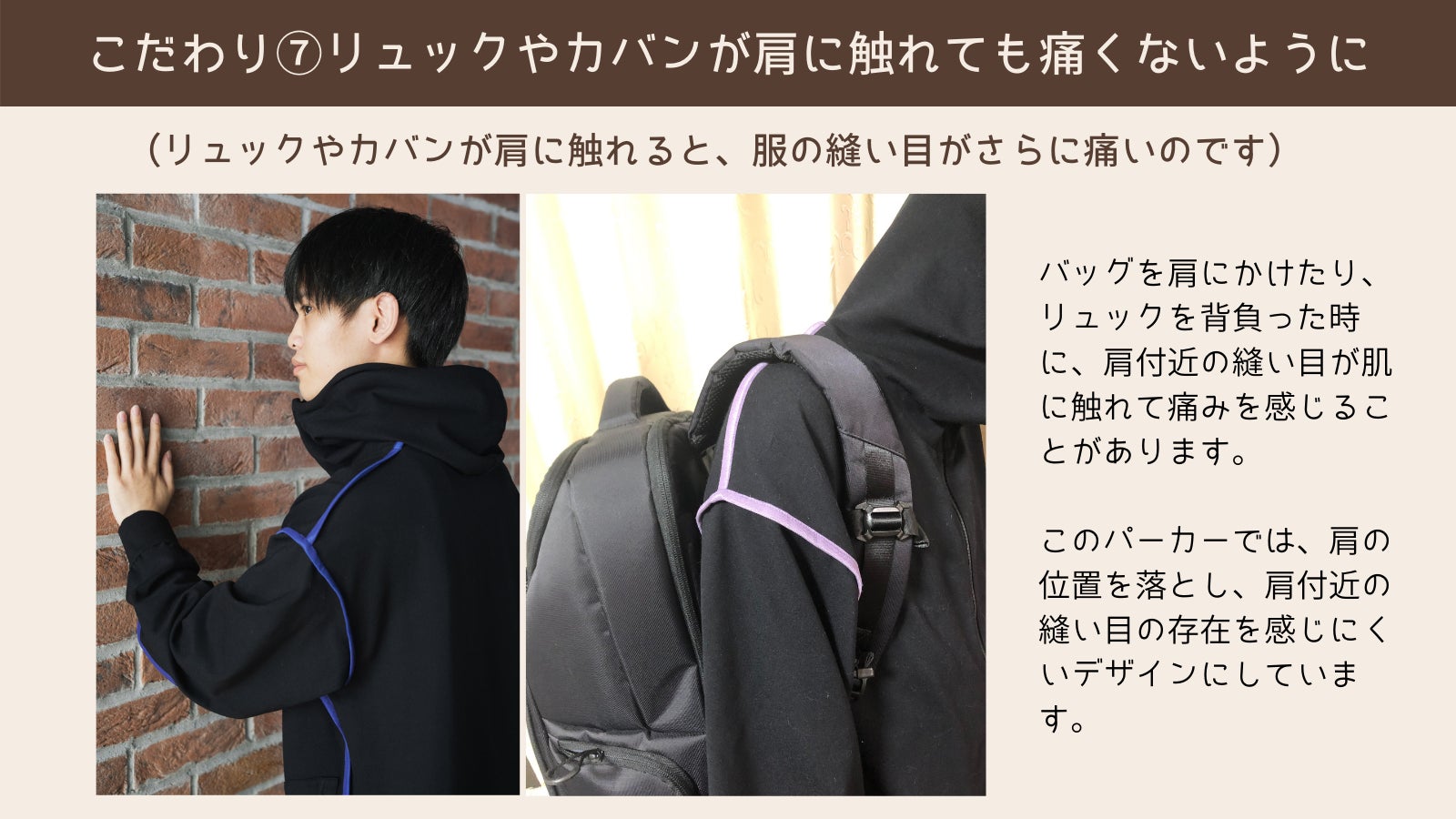 Ver1.0としているのは、これが完成形ではなく、みなさんの意見をいただきながら改良してくつもりだからです。感覚過敏や皮膚の敏感さで困っている人だけでなく、着心地のいい服を探している人や、「このパーカーかっこいい!」と思ってくださる方々に袖を通していただき、みんなで完成形を目指したいです。