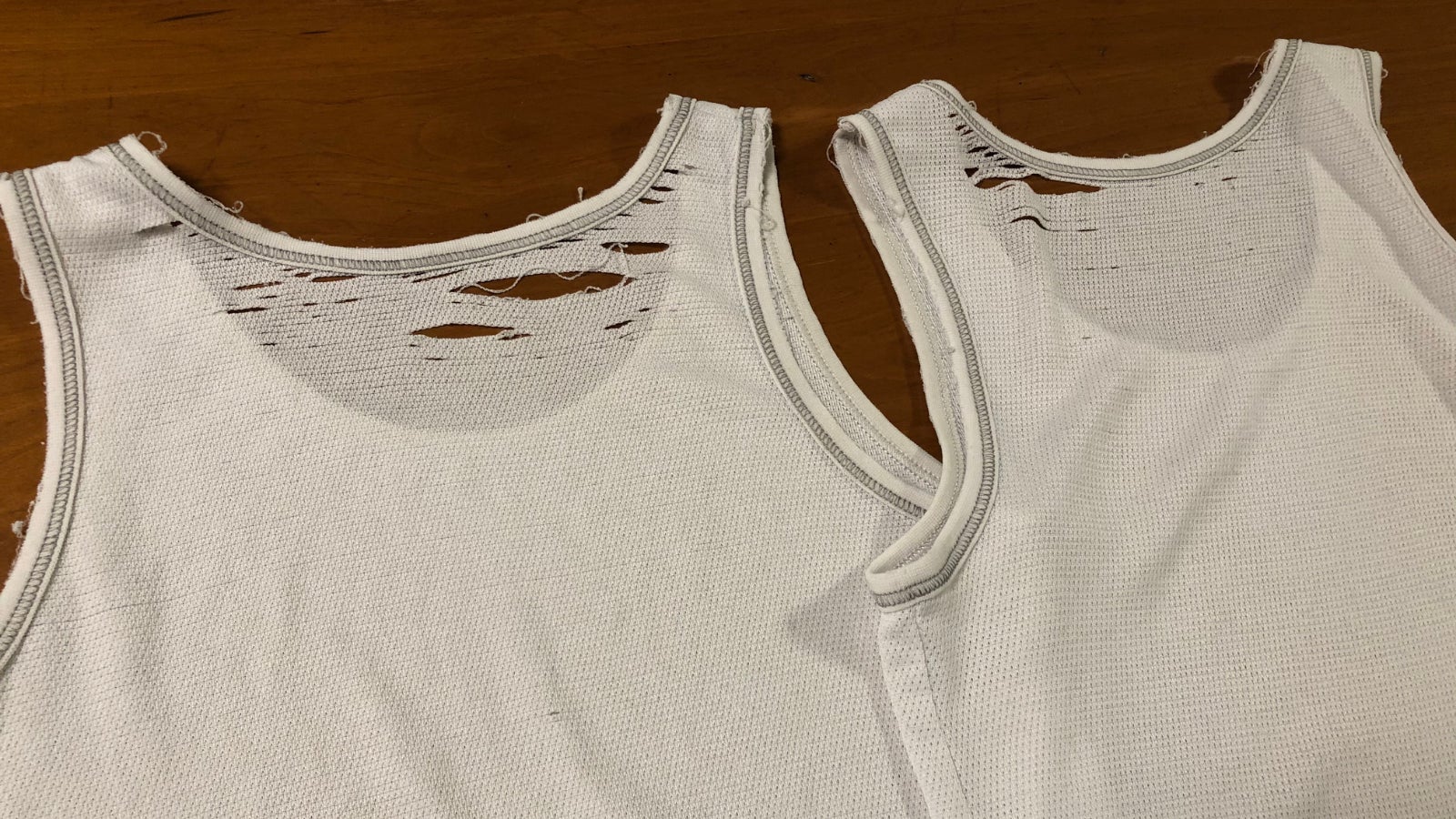 上の写真は僕の日常です。家では1年中、ランニングシャツとパンツだけです。なぜなら、服が痛いのです。写真のランニングシャツ、実は小学5年生から着ています。5年以上、着続けています。僕が物を大事にしているからではありません。着られる肌着が見つからないのです。下の写真のように、生地は薄くなり、破れまくっています。この肌着がなくなるとかなりの緊急事態です。