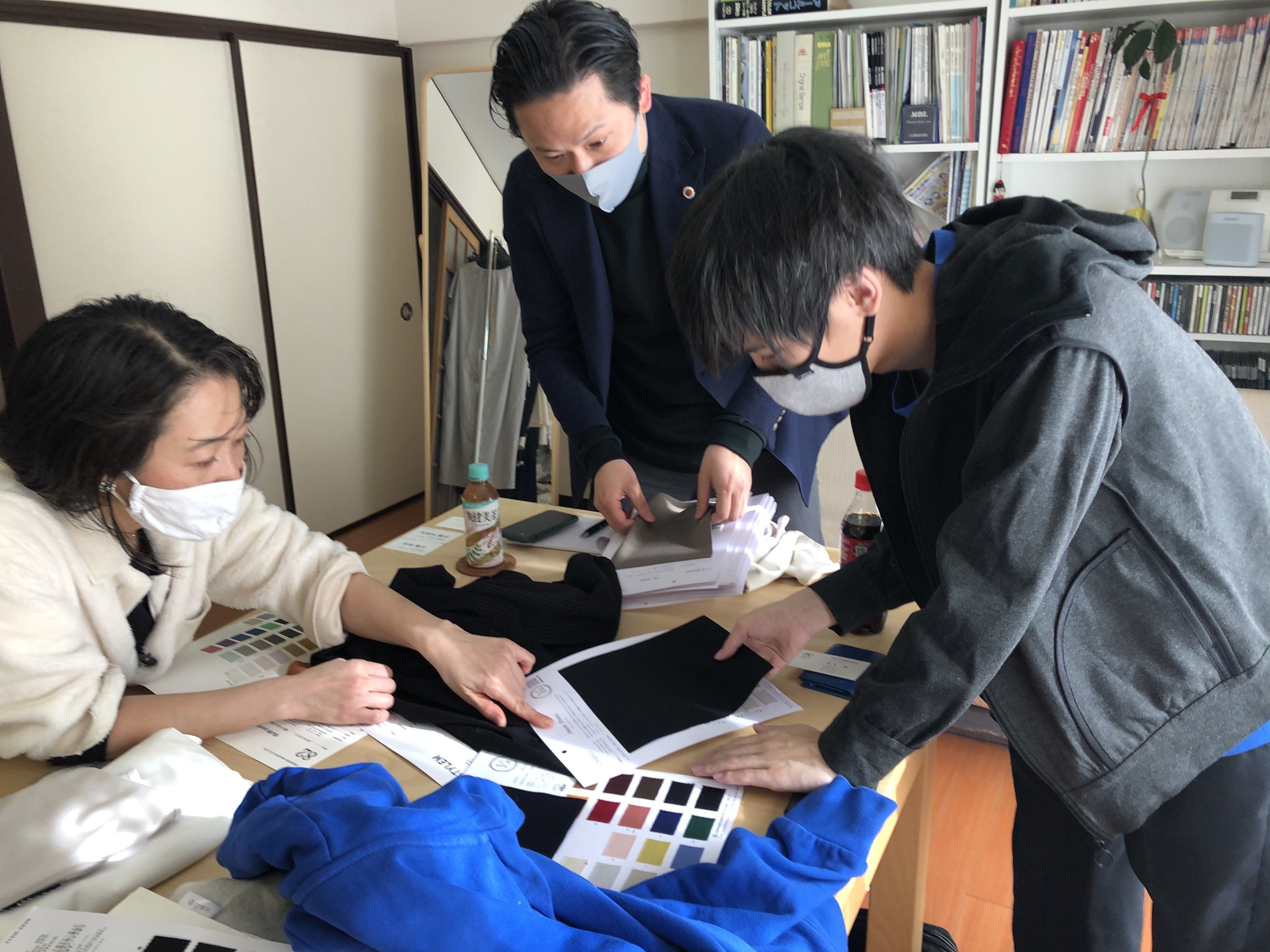 今回の服作りに協力してくださるパタンナーの清水さん(左)と繊維商社・瀧定名古屋の福本さん(中央)