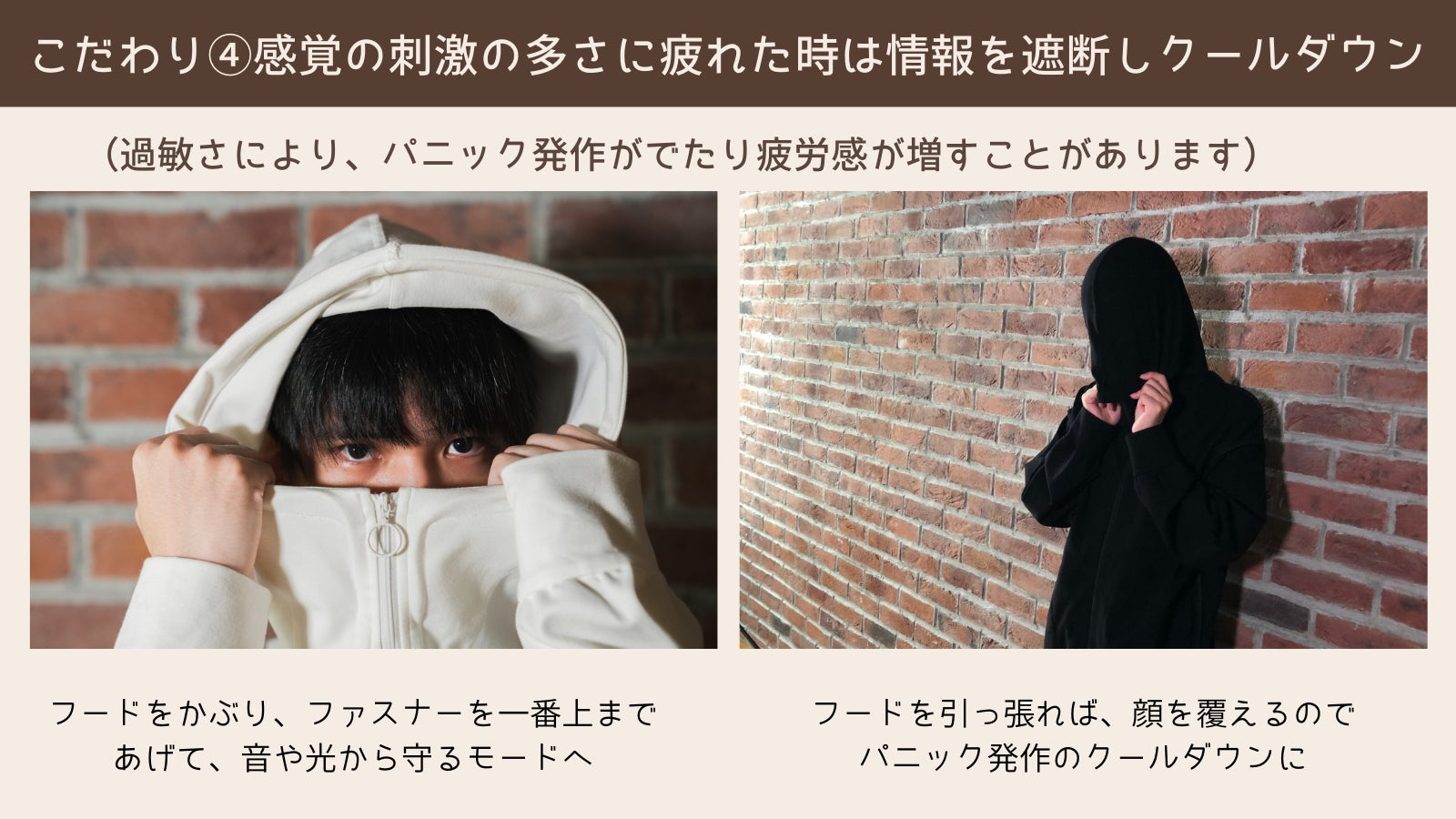 ④感覚の刺激に疲れた時はフードを被ってクールダウン