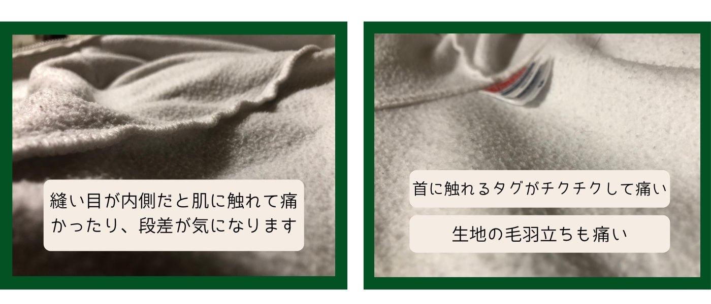 縫い目が外側で、タグはないもの。そして、生地は自分で触って痛くないものを選ぶ。