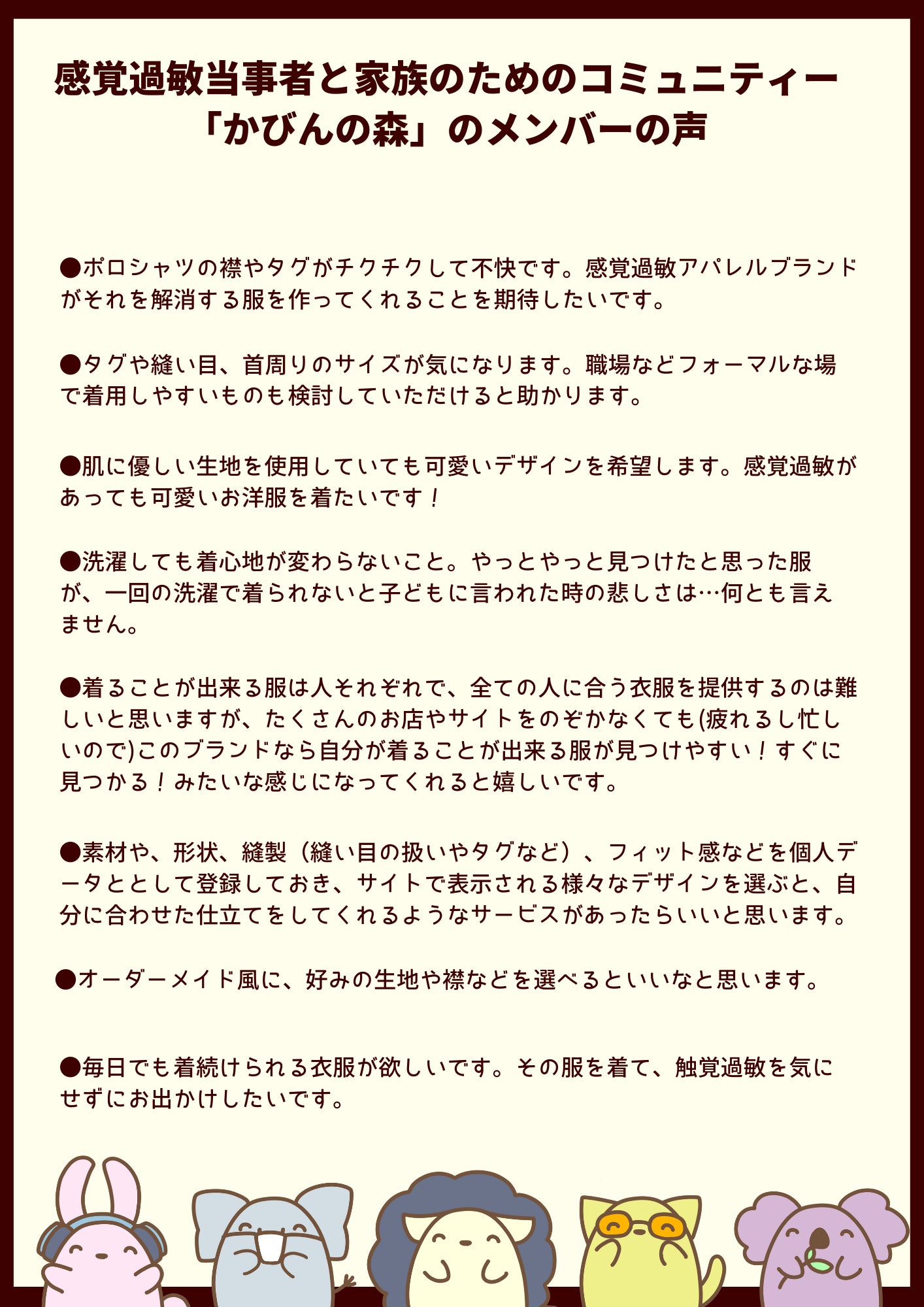 感覚過敏コミュニティー「かびんの森」のメンバーで服に困っている方からの希望もいただきました。