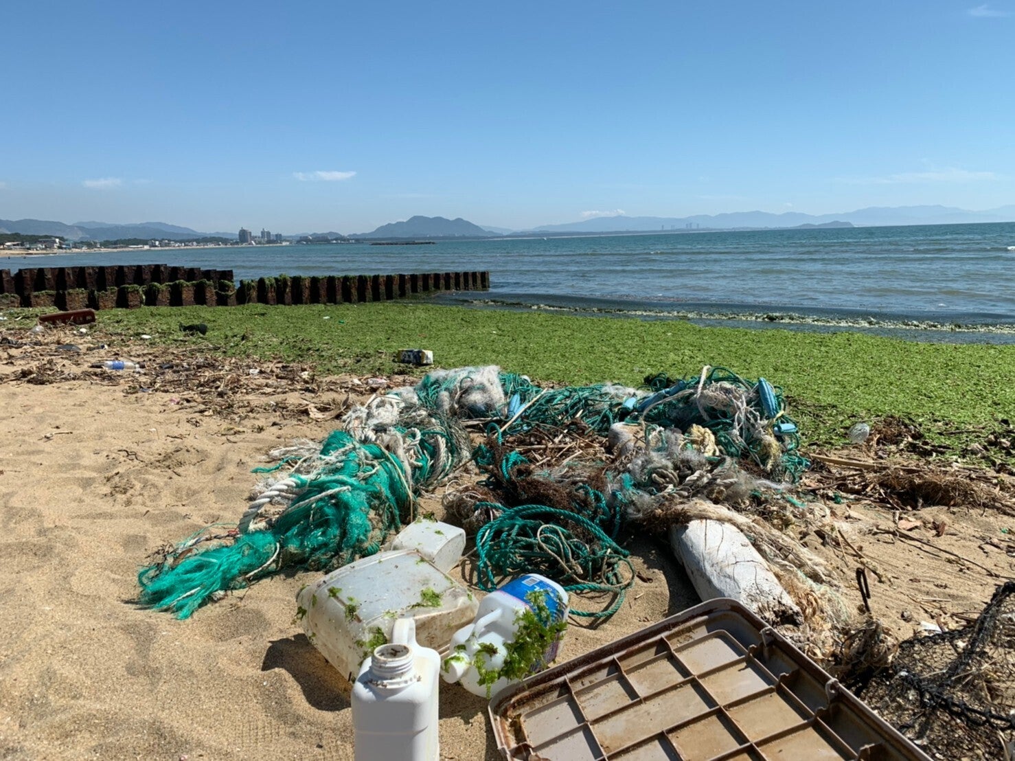 雨天後だったため、海岸にはたくさんの海洋ごみが…。