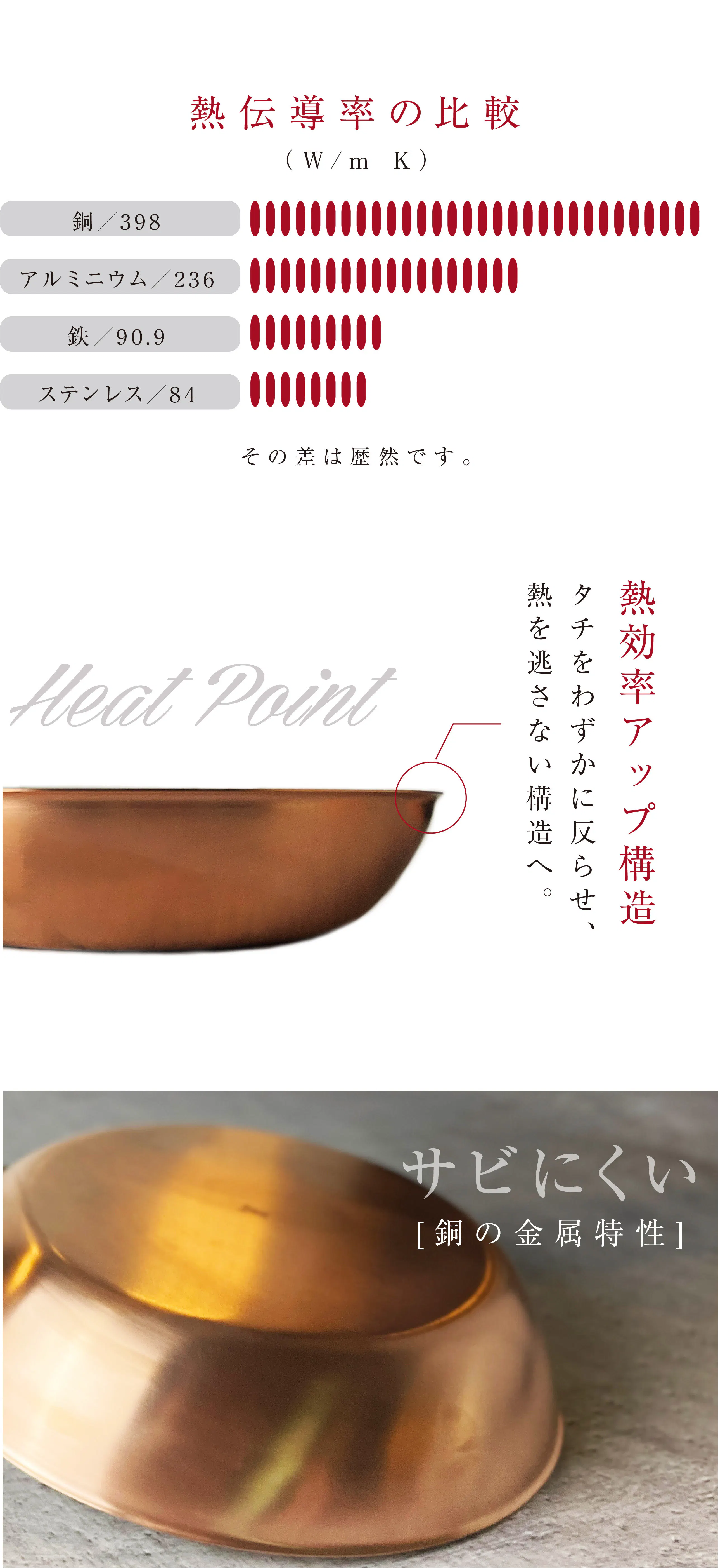 銅の特長である驚異的な「熱伝導率」により、余分な水分を瞬時に飛ばします。