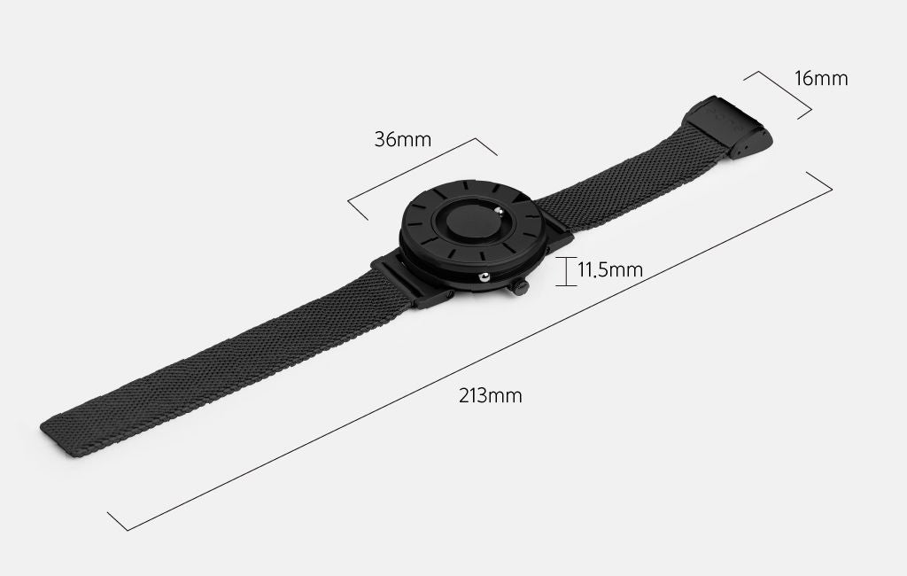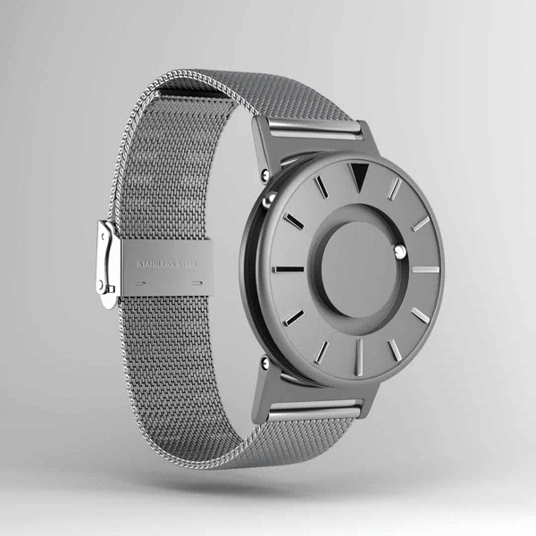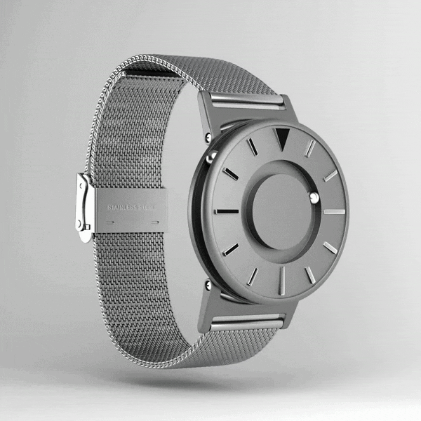 磁力で動く2個の玉は、時計の前面と側面に位置しています。前面にある玉は分(minute)、側面にある玉は時(hour)を指すのですが、これはより頻繁に時間を確認する方のために、より簡単に確認できるように工夫されています。