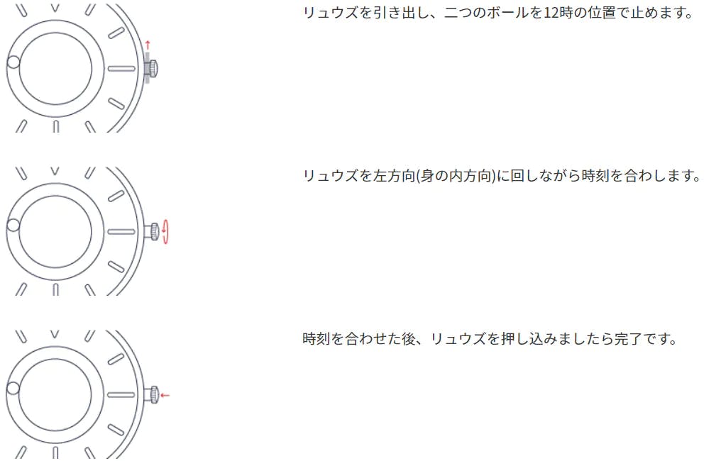 短針と長針の代わりに正面と側面のボールが時間と分を表示して目で読むか指先で触って時間を確認します。
