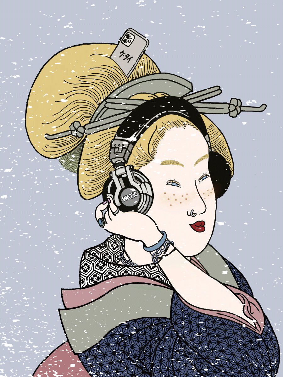 海外のブロンド女性が着物を着てヘッドフォンで音楽を聴いているという一枚です。『和をもっと身近に』というWATICのコンセプトを元に、カルチャーを自由に楽しむ姿を表現しています。