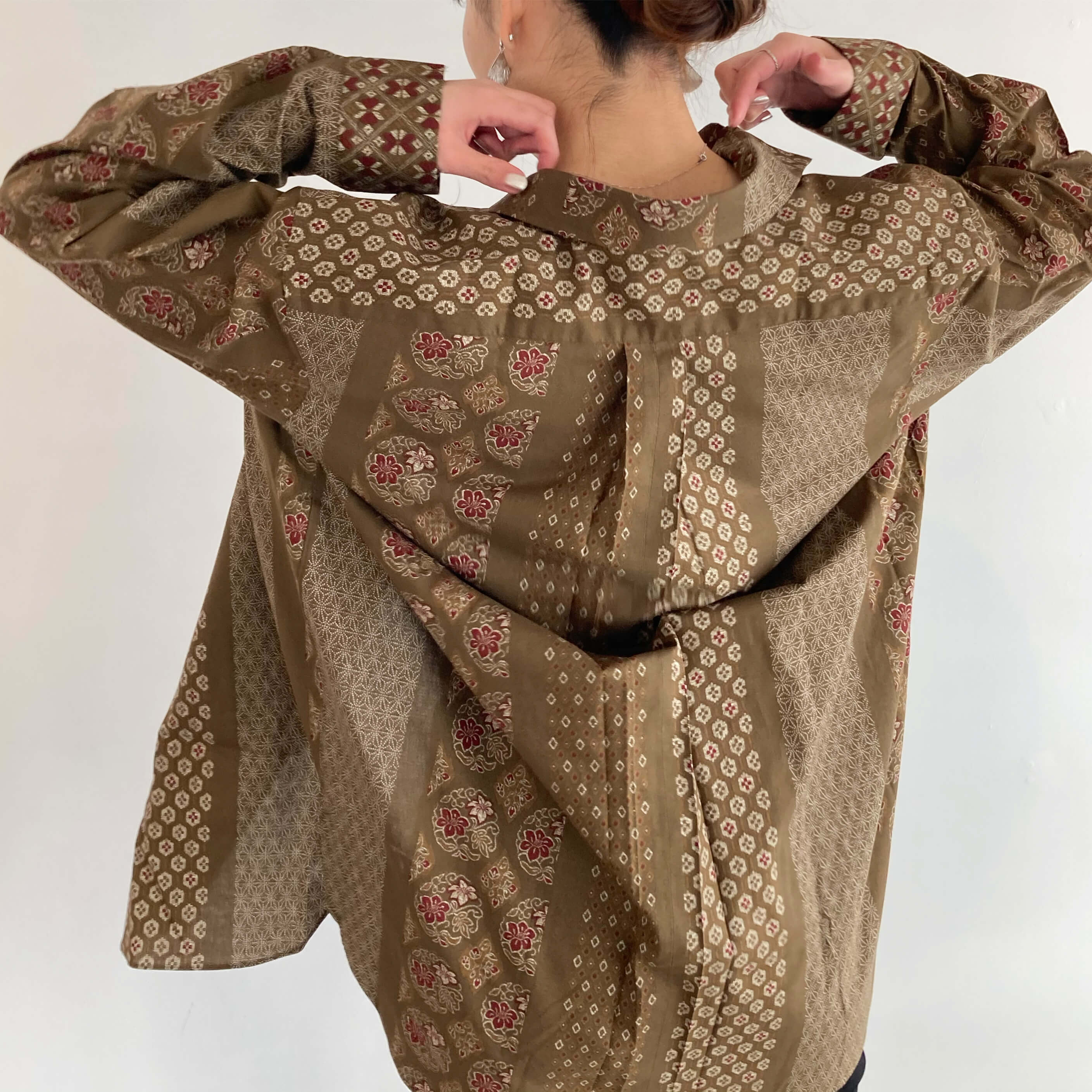 着物生地のリアルな質感や繊細なデザインを使用したユニセックスの総柄シャツを作ります。