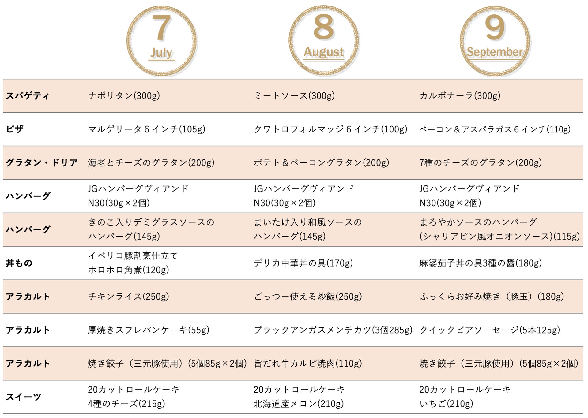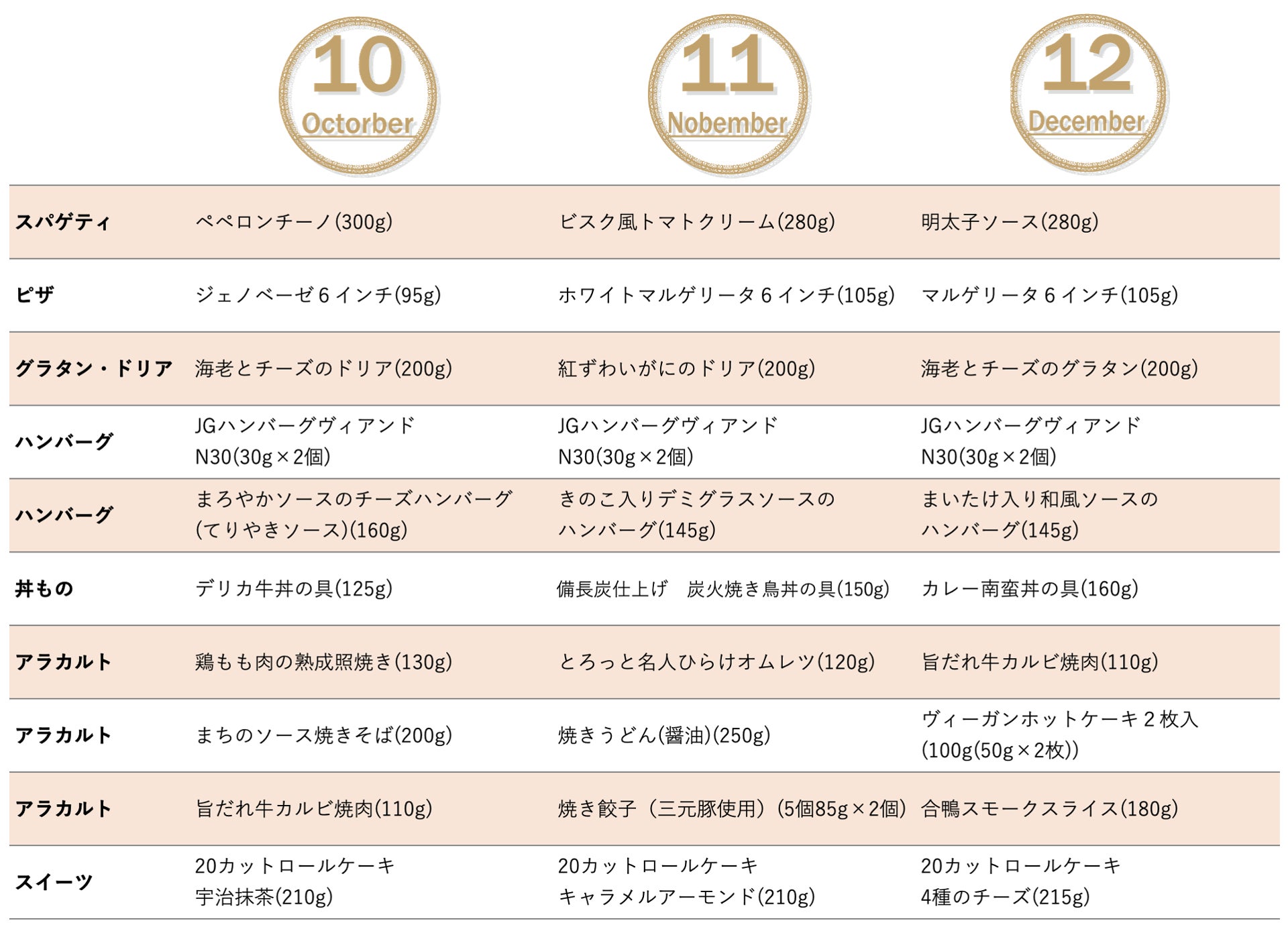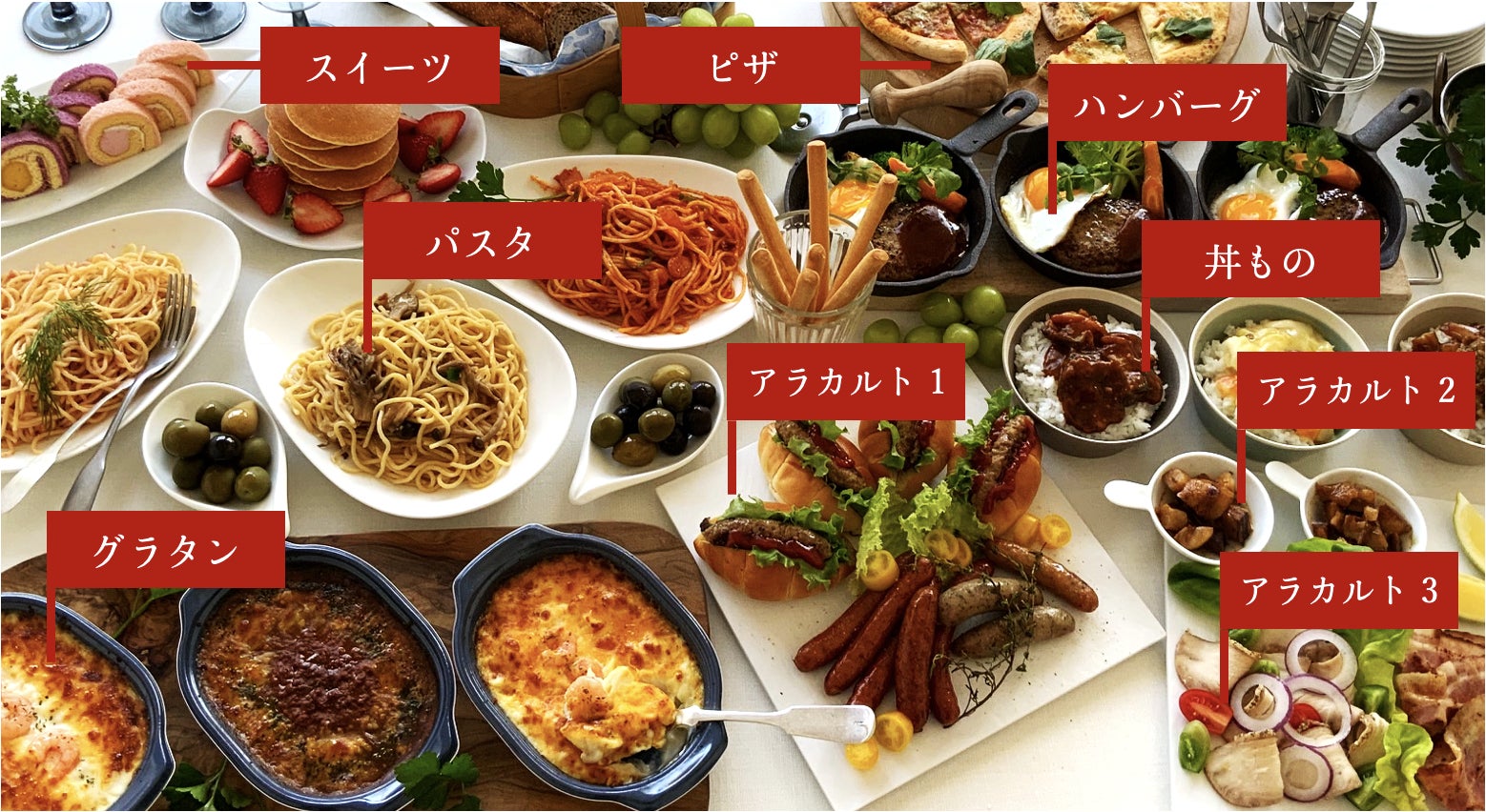 全10種類(①スパゲティ、②ピザ、③グラタン・ドリア、④ハンバーグ×2商品、⑤丼の具、⑥アラカルト×3商品、⑦スイーツ)の料理から月1回ご提供いたします。1回で約1,600g分お送りしますので、4名で食事していただいてもみなさまお腹いっぱいになります。月ごとにコース料理の中身が変わりますので、さまざまなお味をお楽しみください。
