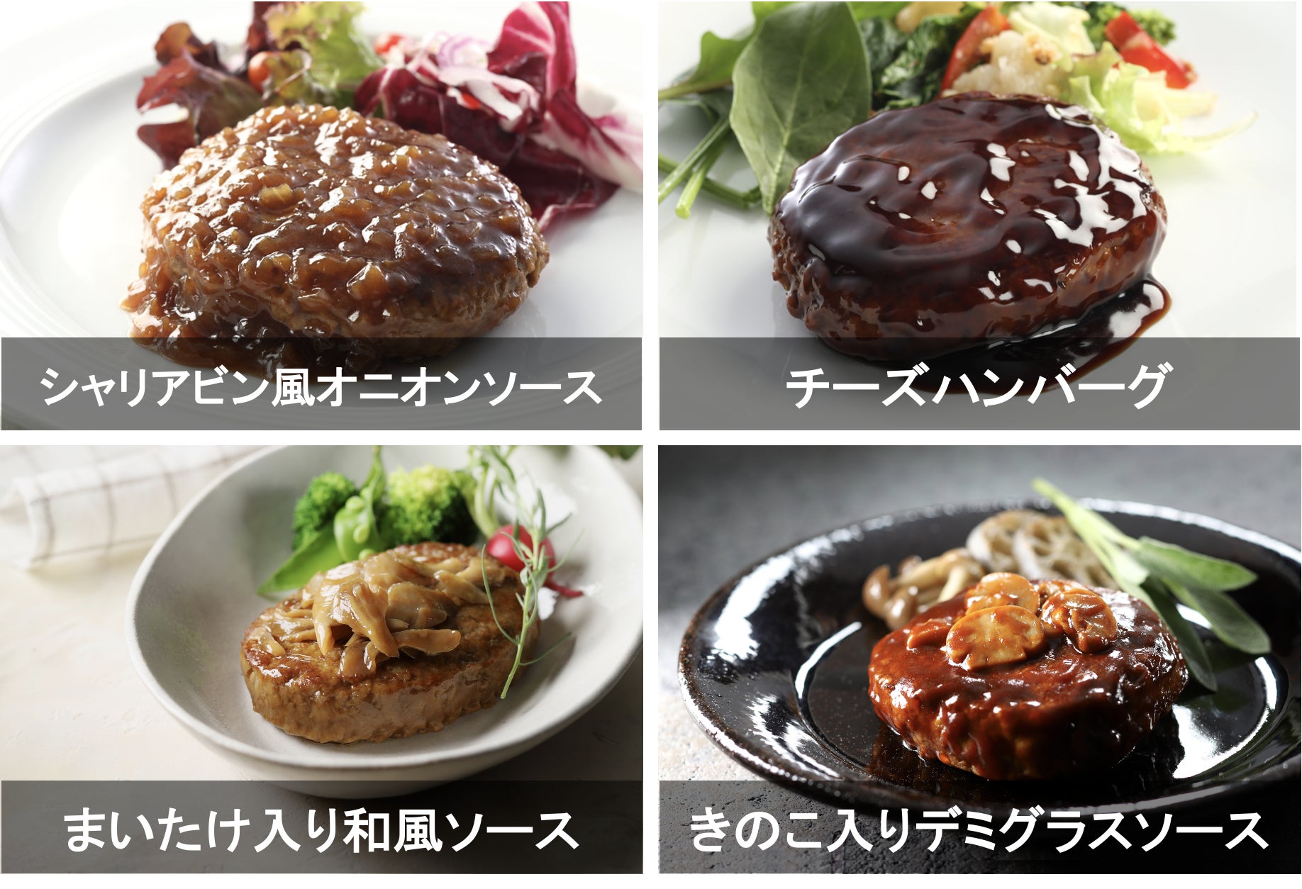 ジューシーでほぐれ感のあるハンバーグを鉄板で両面焼きにし、醤油ベースのオニオンソースやマッシュルーム入りのデミグラスソースなど各種ソースと合わせた個食タイプの商品です。