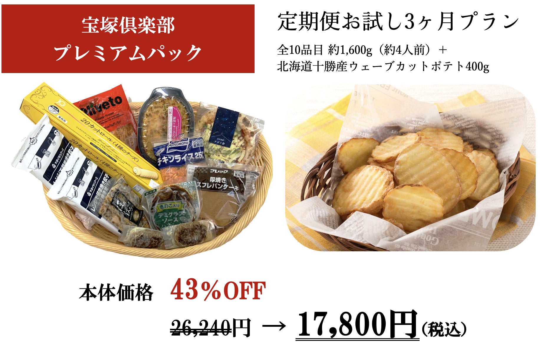 お試し3回パックでは「北海道十勝産中藪農園ウェーブカットポテト400g」、6回パックでは「国産牛肉しぐれ煮100g」を初回配送時(※7月納品分のみ)に提供いたします。