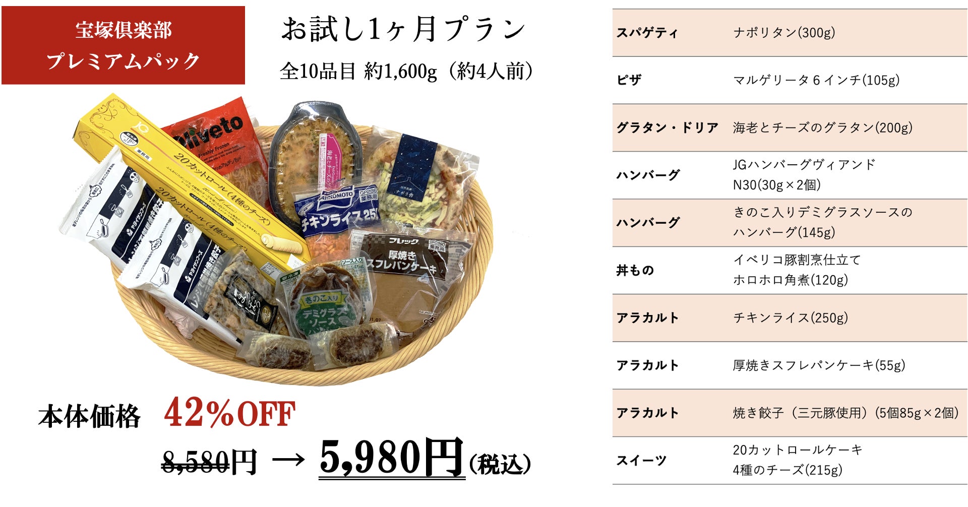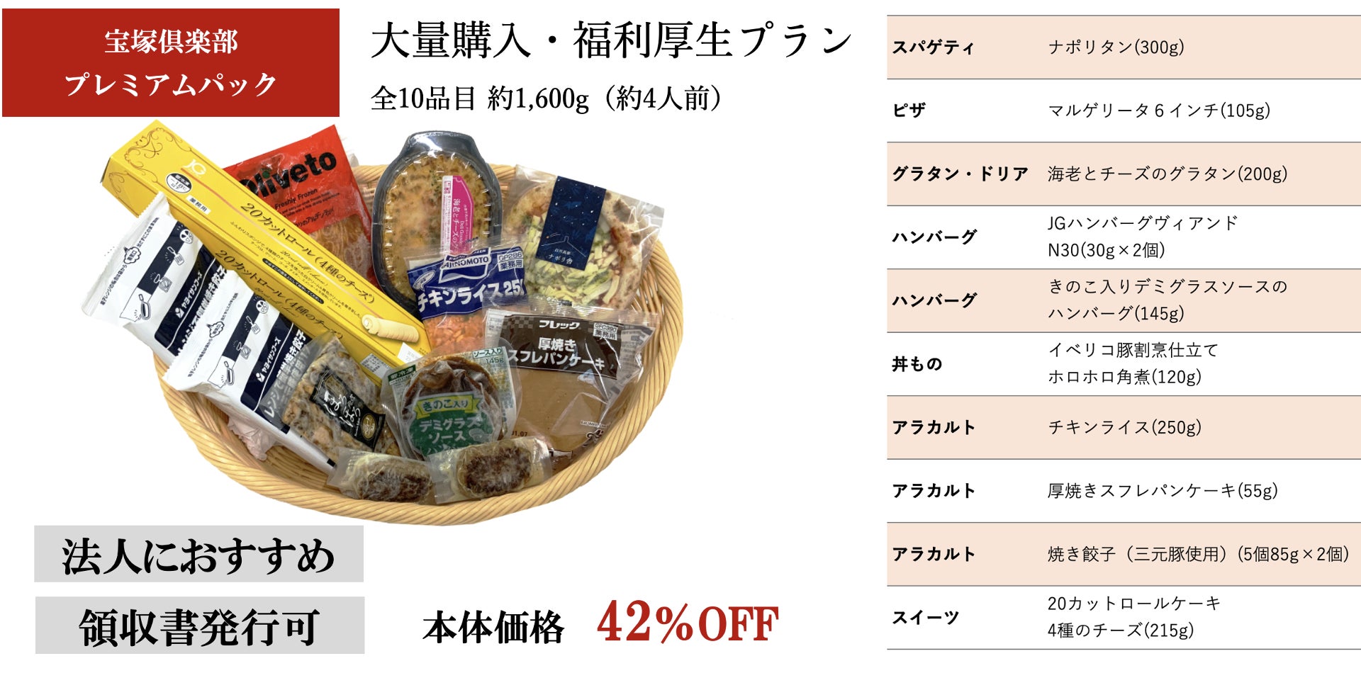 今回のリターンである「宝塚倶楽部 プレミアムパック」を取り扱っている宝塚倶楽部では日本全国の名店の味から、電子レンジや湯煎で簡単にカフェやレストランの味が楽しめる、業務用の冷凍食品の数々を取り揃えています。