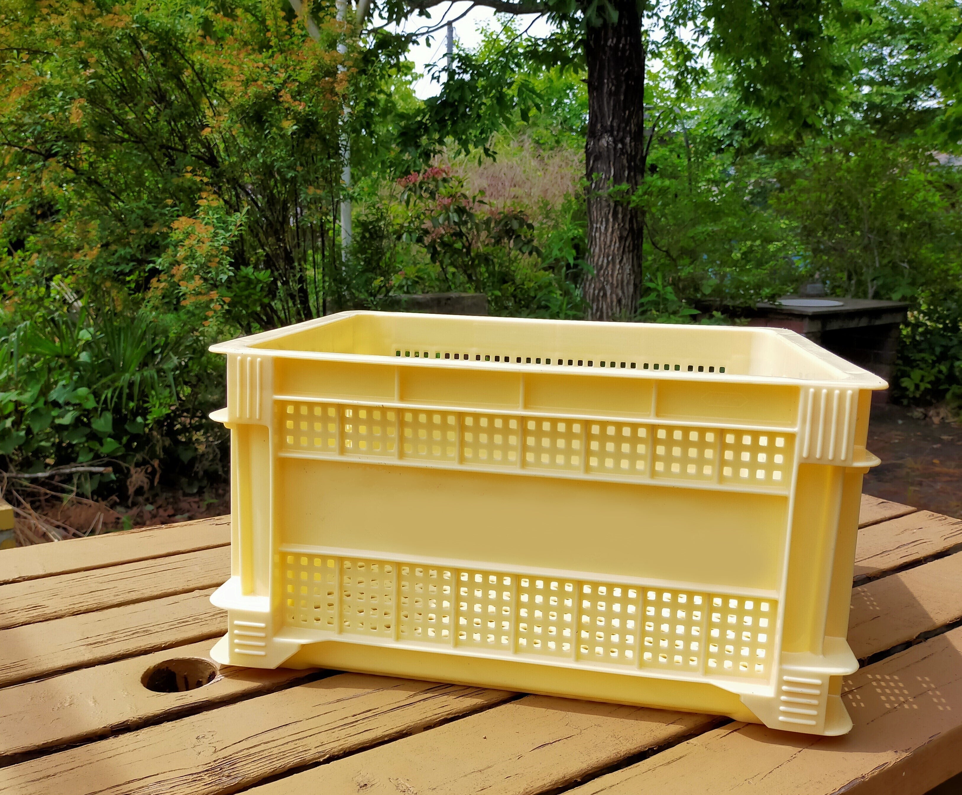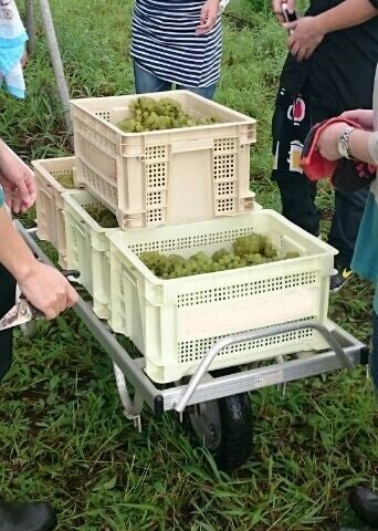 今回購入させていただくのは「サンテナー」という商品名の収穫カゴで、ワイナリーの現場ではわりと良く見るコンテナです。一つのコンテナでちょうど10㎏のぶどうが収まるサイズで、コンテナの数を数えれば総重量が素早く計算できる、という事から扱いやすい商品で、弊社も収穫する際には使わせていただいています。