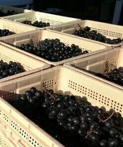 (収穫カゴに入ったブドウ達です。重ねて積まれていますが、全部で150箱近くあります。)