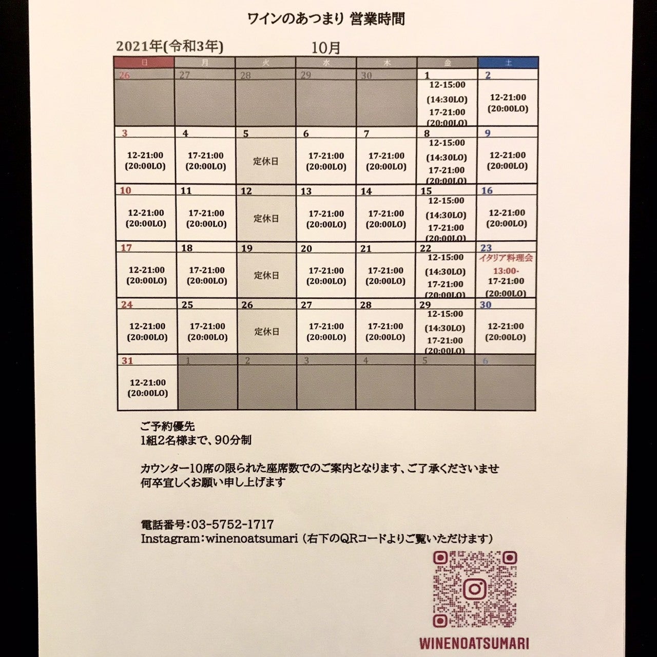 ※23日(土)につきましてはイベントの為、17:00~21:00の営業となります